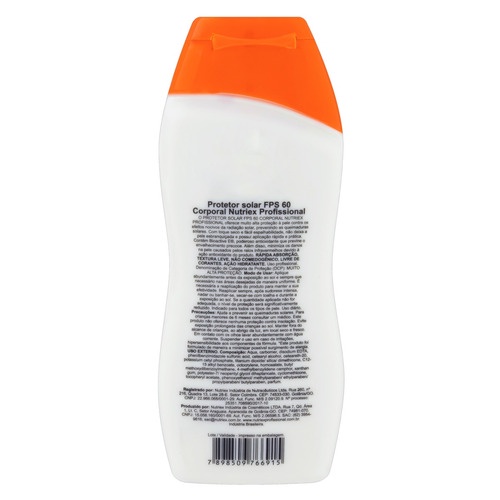 O Protetor Solar FPS 60 Corporal Nutriex Profissional oferece muito alta proteção à pele contra os efeitos nocivos da radiação solar, prevenindo as queimaduras solares. Com toque seco e fácil espalhabilidade, não deixa a pele esbranquiçada e possui aplicação rápida e prática. Contém Bioactive E®, poderoso antioxidante que previne o envelhecimento precoce. Além disso, minimiza os danos na pele causados pelos raios infravermelhos devido à ação antioxidante do produto. RÁPIDA ABSORÇÃO, TEXTURA LEVE, NÃO COMEDOGÊNICO, LIVRE DE CORANTES, AÇÃO HIDRATANTE. Uso profissional. Proteção reforçada para o rosto Proteção contra raios UVA e UVB. Adequado à Nova Legislação. Uso diário. Previne contra o envelhecimento precoce. Indicado para pele altamente sensível; Hipoalergênico; Muito resistente a água e suor; Possui vitamina E, prevenindo o envelhecimento precoce da pele; Espalha com facilidade e não deixa a pele esbranquiçada; Rápida absorção; Ação hidratante; Suave fragrância; Não comedogênico.