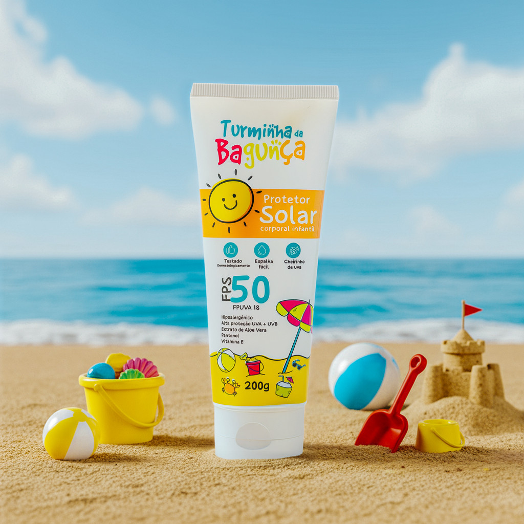 ## 🧴 **Protetor Solar Infantil Turminha da Bagunça FPS 50** Proteção segura, delicada e divertida para a pele das crianças! Com textura leve, cheirinho suave e fórmula que **espalha fácil**, o Protetor Solar Turminha da Bagunça FPS 50 foi desenvolvido especialmente para o **uso diário** — na escola, no parque, na praia ou na piscina. 🌞💛 --- ### ✨ **Benefícios** * **FPS 50** com proteção ampla **UVA + UVB** * **Dermatologicamente testado** * **Hipoalergênico** (ideal para peles sensíveis) * **Textura leve**, não deixa pegajoso * **Espalha facilmente** e absorve rápido * **Não deixa branco** e não esfarela * **Cheirinho suave e agradável** * Pode ser usado **no rosto e no corpo** * Indicado para **bebês e crianças** --- ### 🍇 **Diferenciais da Turminha da Bagunça** * Produto desenvolvido **especialmente para pele infantil** * Fórmula delicada com **Aloe Vera + Vitamina E** * Embalagem divertida que incentiva a criança a usar * Qualidade **de marca confiável** e reconhecida --- ### 📦 **Tamanhos Disponíveis** | Tamanho | Ideal para | Benefício | | -------- | ------------------------ | --------------------------------- | | **200g** | Mochila / Bolsa / Escola | Mais praticidade no dia a dia | | **500g** | Casa / Creche / Família | **Mais economia** e rendimento 🚀 | --- ### ☀️ **Modo de Uso** 1. Aplique uma camada generosa sobre a pele seca. 2. Reaplique sempre que necessário. 3. Reforçar após **suor, praia, piscina ou banho**. --- ### ⚠️ **Importante** Nenhum protetor solar oferece proteção total. Mantenha as crianças em locais com sombra nos horários mais quentes. --- ### 🛒 **Por que escolher este protetor?** Porque **protege de verdade**, não irrita a pele, tem cheiro gostoso, espalha fácil e ainda faz a criança querer usar! É proteção com **carinho + diversão.** 💛