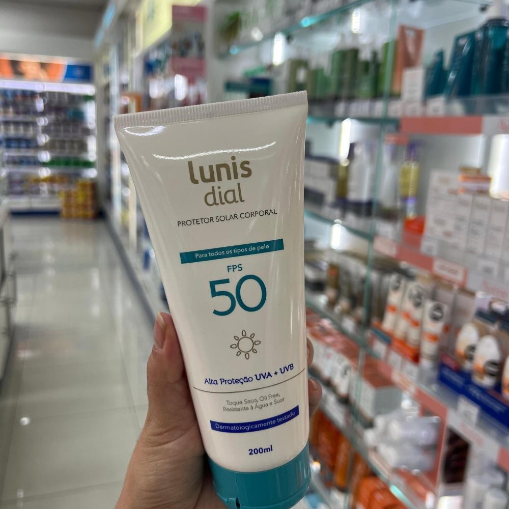 **Produto Original** Proteja sua pele em todos os momentos com Protetor Solar Lunis Dial Modo de usar: Aplique no corpo abundantemente antes da exposição ao sol e sempre que necessário. Após a aplicação, aguardar 30 minutos para se expor ao sol. Reaplicar sempre, após sudorese intensa, nadar ou banhar-se, secar-se com toalha e durante a exposição ao sol. É necessária a reaplicação do produto para manter a sua efetividade. Se a quantidade aplicada não for adequada, o nível de proteção será significativamente reduzido. Deve-se reaplicar o produto a cada 2 horas enquanto estiver exposto ao sol. Vantagens e benefícios: FPS50 (UVA+UVB) - Alta proteção para pele muito sensível a queimadura solar Formulado para todos os tipos de pele Toque seco Oil free Resistente à água e suor Dermatologicamente testado Não testado em animais