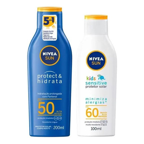 KIT PROTETOR SOLAR FPS50 200ML + PROTETOR SOLAR KIDS FPS60 100ML Para quem quer se expor ao sol, mas necessita de proteção, a dica é o protetor solar corporal Nivea Sun Protect & Hidrata FPS 50, 200ml, textura líquida que possui um sistema de filtro UVA/UVB, com alta proteção imediata, e previne o envelhecimento da pele causado pela exposição solar. Sua exclusiva fórmula livre de óleos é enriquecida com Pantenol, um ativo que promove o equilíbrio e hidratação prolongada à pele, mantendo-a hidratada por mais tempo. Nesta embalagem contém uma unidade que é acompanhada por um protetor solar infantil Kids Sensitive Nivea Sun, FPS 60, 100ml, que possui fórmula com extra proteção imediata contra os raios UVA/UVB. Foi especialmente desenvolvido para minimizar o possível surgimento de alergias, pois não contém perfumes, corantes e conservantes. É dermatologicamente testado sob controle pediátrico. Muito resistente à água.