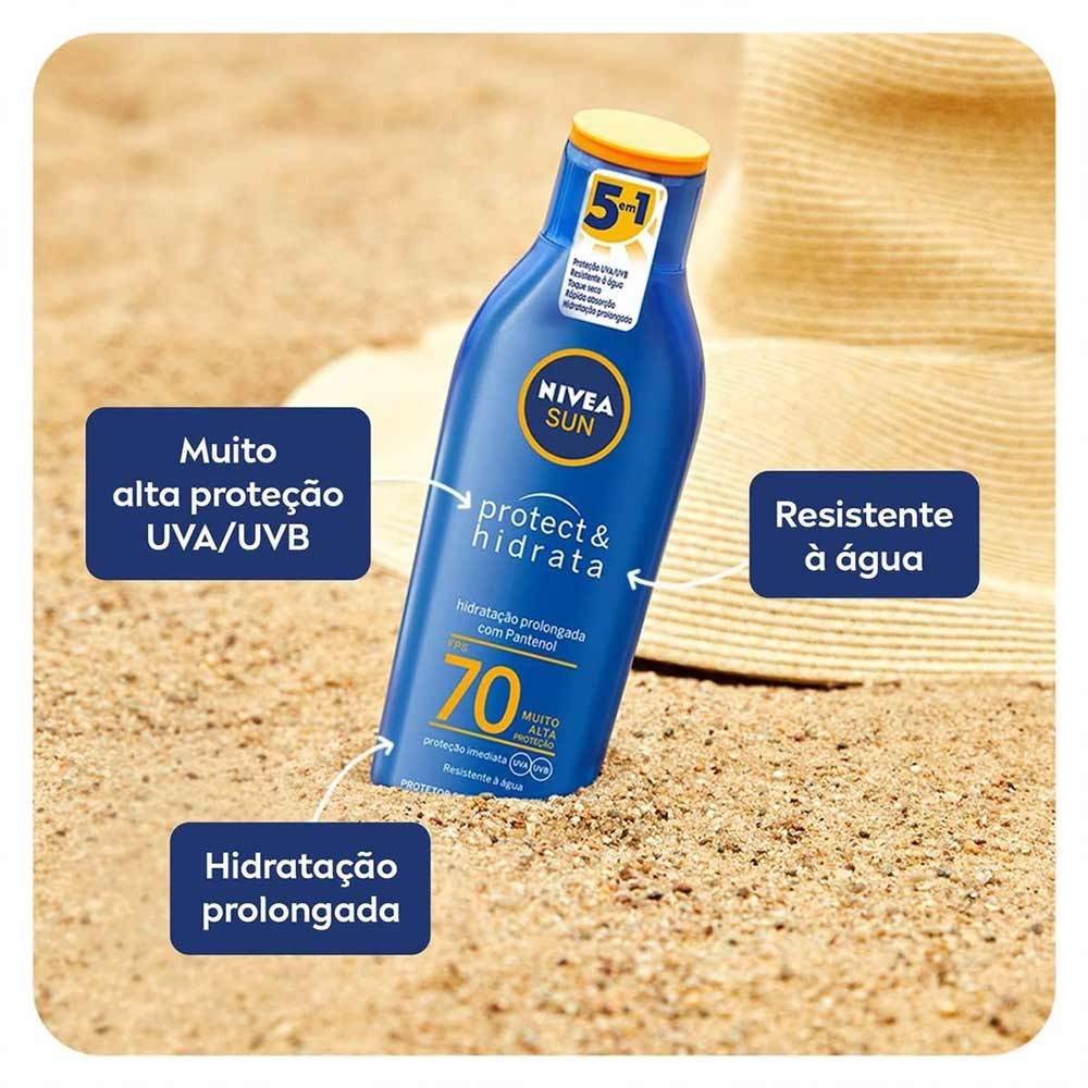 Protetor Solar Protect & Hidrata FPS70 200ml Nivea - 1 Unidade NIVEA SUN Protect & Hidrata possui um sistema de filtro UVA/UVB que oferece muito alta proteção imediata e previne o envelhecimento da pele causado pela exposição solar/radiação. Sua exclusiva fórmula livre de óleos (oil-free) é enriquecida com Panthenol, um ativo que promove o equilíbrio e hidratação prolongada à pele, mantendo-a hidratada por mais tempo. - Muito alta proteção contra os raios UVA/UVB - Resistente à água - Toque seco - Rápida absorção - Hidratação prolongada
