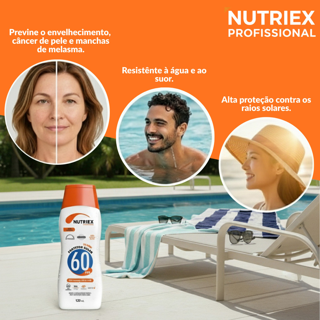 Protetor Solar Nutriex FPS 60 120ML O Protetor Solar Nutriex FPS 60 oferece proteção superior contra os efeitos nocivos do sol, desenvolvido com a avançada tecnologia Bioactive E®. Sua fórmula enriquecida com Vitamina E ajuda a prevenir o envelhecimento precoce, enquanto protege a pele dos raios UVA e UVB, com alta resistência à água e ao suor. Com toque seco, rápida absorção e fragrância suave, o protetor não deixa a pele esbranquiçada e proporciona conforto durante o uso. É hipoalergênico, oil free e não provoca acne, sendo indicado para todos os tipos de pele. Ideal tanto para uso diário quanto para atividades ao ar livre com alta exposição solar. Benefícios: * FPS 60 ? proteção solar intensiva contra queimaduras e danos causados pelo sol * Bioactive E® + Vitamina E ? ação antioxidante, previne envelhecimento precoce * Hipoalergênico e dermatologicamente testado * Oil Free ? não oleoso, não obstrui os poros * Não provoca acne Rápida absorção e aplicação fácil * Fragrância suave * Não deixa a pele esbranquiçada * Muito resistente à água e ao suor * Proteção reforçada: UVA superior a 1/3 de UVB * Indicado para uso diário e exposição prolongada ao sol Modo de Aplicar : Aplique abundantemente sobre a pele antes da exposição solar. Reaplique sempre que necessário, especialmente após suar em excesso, nadar, se secar com toalha ou em períodos prolongados sob o sol. Para crianças menores de 6 meses, consulte um médico antes da utilização. Nuvem de Tags: Protetor Solar, Nutriex, Fps 60, Bioactive E, Vitamina E, Toque Seco, Uso Diário, Oil Free, Hipoalergênico, Não Oleoso, Não Provoca Acne, Resistente Água, Resistente Suor, Proteção Uva, Proteção Uvb, Alta Proteção Solar, Proteção Intensa, Rápida Absorção, Fragrância Suave, Não Esbranquiça, Cuidados Com A Pele, Anti Envelhecimento.