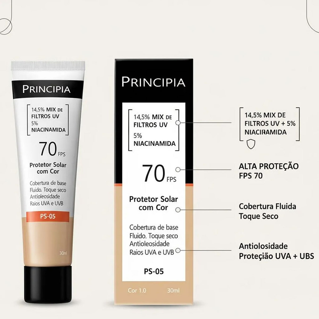 Principia Protetor Solar com Cor PS-05 (Cor 1.0): Proteção FPS 70 e Tratamento de Skincare em um Só Produto Alcance a máxima proteção solar com o Protetor Solar com Cor PS-05 da Principia na Cor 1.0, ideal para tons de pele mais claros. Este produto é a fusão perfeita entre alta proteção FPS 70 e uma maquiagem leve de cobertura. Fórmula Potente e Avançada: Alta Proteção Solar (FPS 70): Defende a pele de forma superior contra os raios UVA e UVB, prevenindo o fotoenvelhecimento e o surgimento de hiperpigmentação. 14,5% de Mix de Filtros UV: Uma concentração robusta de filtros solares para garantir segurança e estabilidade. 5% de Niacinamida: Um ativo multifuncional que proporciona benefícios de skincare, como controle da oleosidade, redução da aparência de poros e fortalecimento da barreira cutânea. Cobertura e Acabamento: Cobertura de Base Fluida: Uniformiza o tom da pele, cobrindo pequenas imperfeições com um acabamento leve e natural. Toque Seco e Antioleosidade: Sua formulação é especialmente indicada para peles mistas e oleosas, controlando o brilho excessivo ao longo do dia, sem deixar a pele pegajosa. Use o Principia PS-05 todos os dias para proteger, tratar e uniformizar sua pele de maneira prática e eficaz. Disponível no formato de 30ml.