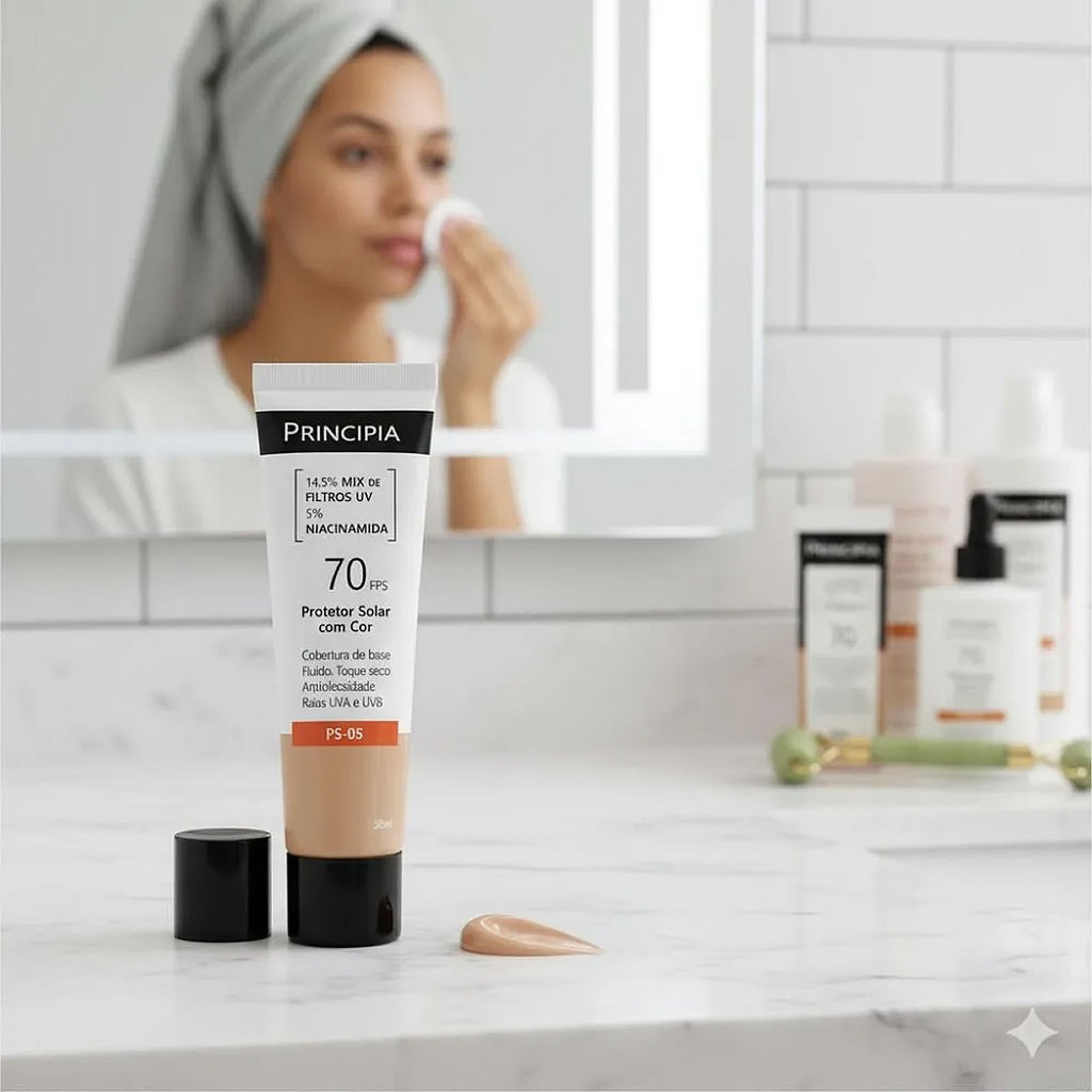 Protetor Solar Principia Niacinamida FPS70 Cor 2.0 PS-05 30ml O Protetor Solar Facial com Cor PS-05 da Principia na tonalidade Cor 2.0 é a união perfeita entre dermocosmético e maquiagem. Ele oferece altíssima proteção solar (FPS 70) e um tratamento eficaz para a pele oleosa, garantindo um acabamento natural e uniforme para peles claras a médias. Potência em Ativos e Proteção: Alta Proteção Multiespectral (FPS 70): Com 14,5% Mix de Filtros UV, oferece defesa robusta contra os raios UVA e UVB, além de proteger contra a Luz Visível e Luz Azul (de telas e iluminação), ajudando a prevenir e combater o surgimento de manchas. 5% Niacinamida (Vitamina B3): Este ingrediente ativo de alta performance proporciona benefícios complementares essenciais: Controle da Oleosidade: Regula a produção de sebo, reduzindo o brilho e a oleosidade excessiva da pele. Ação Antioxidante e Uniformizadora: Auxilia na redução de acnes, cravos e melhora a uniformidade do tom da pele. Cobertura de Base Fluida: A Cor 2.0 disfarça imperfeições e confere um aspecto de "pele natural" com cobertura leve e homogênea. Toque Seco: A textura fluida e leve é absorvida rapidamente, deixando a pele com um acabamento antioleosidade, confortável e sem sensação pegajosa. Fórmula Segura e Prática: Resistente à Água e ao Suor Hipoalergênico e Não Comedogênico (não obstrui os poros). Livre de parabenos, petrolatos, sulfatos, silicones, fragrância e corantes. Modo de Uso: Use diariamente antes da exposição ao sol. Aplique em abundância sobre a pele seca e limpa. Reaplicar é fundamental para manter a eficácia, especialmente após sudorese intensa, nadar ou secar-se com toalha.