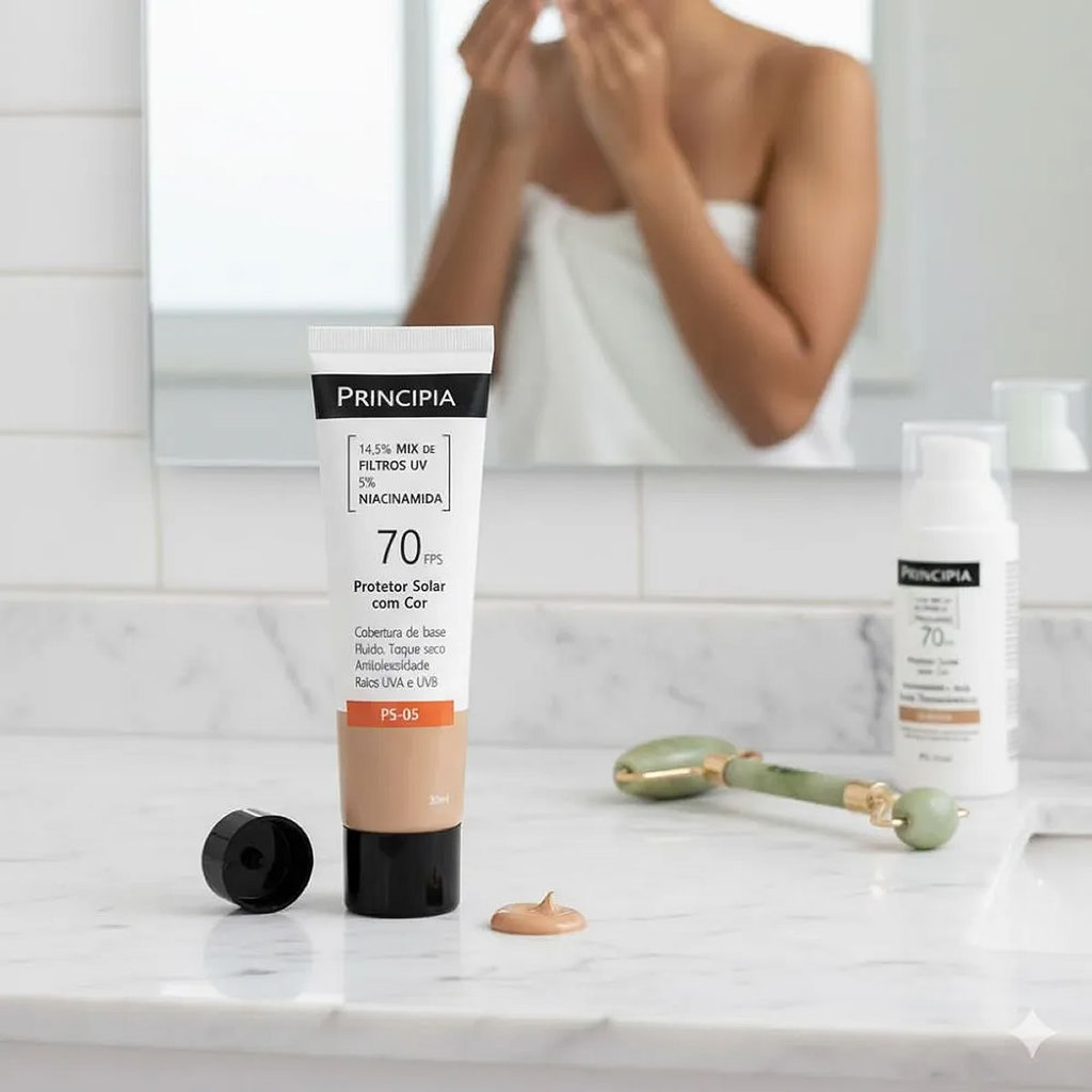 Protetor Solar Principia Niacinamida FPS70 Cor 3.0 PS-05 30ml O Protetor Solar Facial com Cor PS-05 da Principia na tonalidade Cor 3.0 foi desenvolvido para oferecer a máxima proteção solar combinada com o benefício de uma maquiagem leve e natural. Com FPS 70 e um blend de ativos poderosos, é o produto multifuncional que sua rotina de skincare e beleza precisa. Fórmula Avançada e Multifuncional: Super Proteção (FPS 70): Contém 14,5% Mix de Filtros UV que garantem alta e ampla proteção contra os raios UVA e UVB. Defesa Total: Além dos raios solares, protege contra a Luz Visível e Luz Azul (emitidas por telas e lâmpadas), prevenindo e auxiliando na redução de manchas, como o melasma. Efeito Skincare: Enriquecido com 5% de Niacinamida (Vitamina B3), um ativo reconhecido por suas propriedades: Controle da Oleosidade: Ajuda a reduzir o brilho e a oleosidade excessiva, com efeito antioleosidade duradouro. Uniformização da Pigmentação: Contribui para a redução e uniformização do tom da pele. Acabamento Impecável: A Cor 3.0 proporciona uma cobertura de base fluida, que disfarça imperfeições e uniformiza o tom para peles morenas claras a médias, com um acabamento de toque seco e rápida absorção. Segurança: Resistente à água e ao suor, hipoalergênico, não comedogênico e oftalmologicamente testado. Livre de parabenos, petrolatos, sulfatos, silicones, fragrância e corantes. Para Quem: Ideal para todos os tipos de pele, especialmente as oleosas, mistas e aquelas que buscam uniformidade com alta proteção. Modo de Uso: Aplique diariamente e abundantemente sobre a pele limpa e seca, 15 minutos antes da exposição solar. Reaplique sempre após sudorese intensa, nadar, banhar-se, secar-se com toalha e durante a exposição ao sol.
