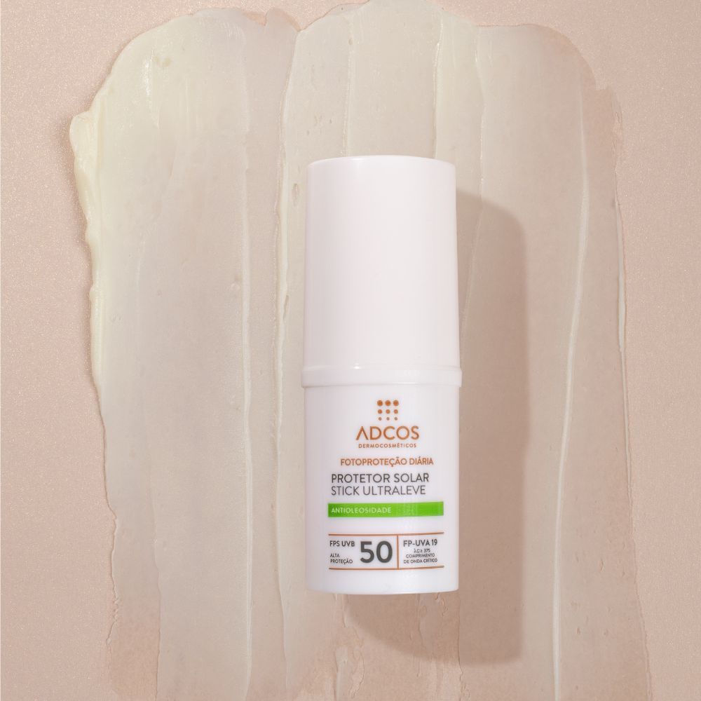 O protetor solar é o principal meio de proteção da pele contra os raios nocivos do sol e a principal forma de prevenir o câncer da pele. Para atender a diversidade da pele brasileira, o protetor solar no formato stick, que é destaque da Adcos, tem agora a versão antioleosidade com FPS 50 e com exclusiva textura ultraleve. Esse é o Protetor Solar Stick FPS 50. O complexo antibrilho é o componente de destaque desse protetor solar facial, que promove ação seborreguladora, reduz a aparência dos poros imediatamente após a aplicação e com uso prolongado. Previne acne, equilibra o microbioma da pele com sensorial macio, sedoso e aveludado sendo indicado para todos os tipos de peles, inclusive mistas e oleosas. Com tecnologia exclusiva ADCOS, além de textura ultraleve, promove efeito optico que disfarça imperfeições imediatamente como poros e rugas finas. O Protetor Solar Stick Ultraleve FPS 50 tem proteção a luz UVA, UVB, infravermelho, protege o DNA celular, possui ação antipoluição e vitamina E (ativo antioxidante). Como benefício adicional, as versões tonalizantes oferecem proteção contra a luz visível e a luz azul. Os estudos comprovaram importante controle da oleosidade da pele facial por até 12 horas após uma única aplicação desse protetor solar. A análise subjetiva por eficácia percebida demonstrou que 100% dos voluntários perceberam o efeito mate na pele e 90% tiveram redução dos poros imediatamente após a aplicação. Seu formato stick é prático, de fácil aplicação e reaplicação, proporcionando proteção à pele durante todo o dia, sem deixá-la pegajosa ou oleosa. Possui também resistência à água, não escorre e não arde os olhos. Se apresenta nas versões incolor e nas 3 cores: peach, nude e beige. - Textura ultraleve. - Ação antibrilho, antiglicante, antioxidante e antipoluição. - Controla a oleosidade por 12 horas. - Reduz poros e disfarça imperfeições. - Ideal para peles mistas e oleosas. - A versão tonalizante protege da luz visível e luz azul. - Cruelty free, hipoalergênico, vegano, não comedogênico e sem parabenos. - Dermatologicamente testado. Escolha a melhor tonalidade do protetor solar, de acordo com o tom da sua pele: - PEACH: tonalidade bege claro, pêssego. - NUDE: tonalidade bege médio, amêndoa. - BEIGE: tonalidade bege escuro, caramelo. *Tonalidades com embalagem nova: Incolor, Peach e Nude.