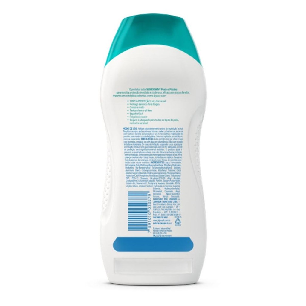 O que é e para que serve? O Protetor Solar Corpo e Rosto SUNDOWN® Praia e Piscina FPS 50, 200mL conta com tripla proteção e ajuda a proteger a pele (corpo e rosto) de elementos agressores como o sol, cloro e a água salgada do mar. Com nova textura mais leve e não pegajosa, oferece proteção imediata UVA + UVB, protegendo a pele de queimaduras solares dentro e fora d'água. É duas vezes mais resistente à água e ao suor e seguro para uso em toda família. Proteção completa para curtir a vida ao ar livre; UVA + UVB balanceado; resistente à água por 2 horas; hidratação prolongada; fotoestável: mesma proteção durante todo o tempo de exposição ao sol. Benefícios e diferenciais Nova textura: mais leve e não pegajosa; Tripla proteção ajuda a proteger a pele de elementos agressores como o sol, cloro e a água salgada do mar; Proteção imediata UVA/UVB; Para corpo e rosto (oil free e não comedogênico); Hidratação prolongada; 2x mais resistente à água e ao suor; Fotoestável: mesma proteção durante todo o tempo de exposição ao sol; Como usar Aplique abundantemente antes da exposição ao sol. Reaplicar sempre, após sudorese intensa, nadar ou banhar-se, secar-se com toalha e durante a exposição ao sol. É necessária a reaplicação do produto para manter a sua efetividade. Deve ser aplicado por adulto ou sob sua supervisão. Composição Aqua, Homosalate, Butyl Methoxydibenzoylmethane, Octocrylene, Glycerin, Aluminum Starch Octenylsuccinate, Methylene Bis-Benzotriazolyl Tetramethylbutylphenol, Ethylhexyl Triazone, Phenoxyethanol, Cetyl Alcohol, Glyceryl Stearate, Hydroxyacetophenone, Potassium Cetyl Phosphate, Hydrolyzed Jojoba Esters, Triacontanyl PVP, PEG-75 Stearate, Acrylates/C10-30 Alkyl Acrylate Crosspolymer, Bis-Ethylhexyloxyphenol Methoxyphenyl Triazine, Diisopropyl Adipate, Parfum, Sodium Polyacrylate, Ceteth-20, Steareth-20, Tocopheryl Acetate, Disodium EDTA, Jojoba Esters, Linalool, Sodium Hydroxide, Limonene, Eugenol, Geraniol, Hydroxycitronellal, Citronellol, Coumarin, Amyl Cinnamal, Alpha-Isomethyl Ionone, Benzyl Benzoate. Precauções Evite contato com os olhos. Caso isso aconteça, enxágue-os com água em abundância. Não usar na pele irritada ou lesionada. Em caso de irritação suspender o uso e procurar orientação médica. Se a quantidade aplicada não for adequada, o nível de proteção será significativamente reduzido. O produto ajuda a prevenir as queimaduras solares, mas não oferece nenhuma proteção contra a insolação. Evite exposição prolongada das crianças ao sol. Para crianças menores de 6 (seis) meses, consultar um médico. Conserve fora do alcance das crianças, em local seco e fresco. Em contato com tecido pode causar manchas.