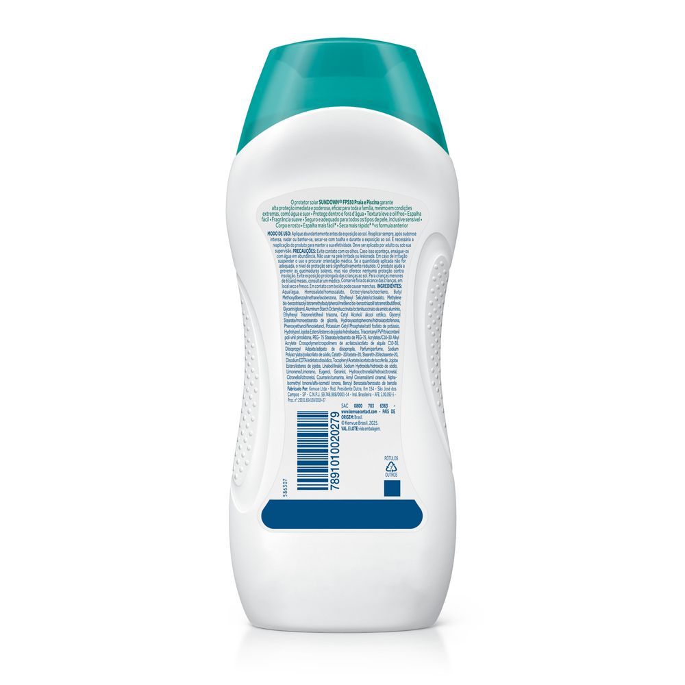 O que é e para que serve? O Protetor Solar Corpo e Rosto SUNDOWN® Praia e Piscina FPS 50, 200mL conta com tripla proteção e ajuda a proteger a pele (corpo e rosto) de elementos agressores como o sol, cloro e a água salgada do mar. Com nova textura mais leve e não pegajosa, oferece proteção imediata UVA + UVB, protegendo a pele de queimaduras solares dentro e fora d'água. É duas vezes mais resistente à água e ao suor e seguro para uso em toda família. Proteção completa para curtir a vida ao ar livre; UVA + UVB balanceado; resistente à água por 2 horas; hidratação prolongada; fotoestável: mesma proteção durante todo o tempo de exposição ao sol. Benefícios e diferenciais Nova textura: mais leve e não pegajosa; Tripla proteção ajuda a proteger a pele de elementos agressores como o sol, cloro e a água salgada do mar; Proteção imediata UVA/UVB; Para corpo e rosto (oil free e não comedogênico); Hidratação prolongada; 2x mais resistente à água e ao suor; Fotoestável: mesma proteção durante todo o tempo de exposição ao sol; Como usar Aplique abundantemente antes da exposição ao sol. Reaplicar sempre, após sudorese intensa, nadar ou banhar-se, secar-se com toalha e durante a exposição ao sol. É necessária a reaplicação do produto para manter a sua efetividade. Deve ser aplicado por adulto ou sob sua supervisão. Composição Aqua, Homosalate, Butyl Methoxydibenzoylmethane, Octocrylene, Glycerin, Aluminum Starch Octenylsuccinate, Methylene Bis-Benzotriazolyl Tetramethylbutylphenol, Ethylhexyl Triazone, Phenoxyethanol, Cetyl Alcohol, Glyceryl Stearate, Hydroxyacetophenone, Potassium Cetyl Phosphate, Hydrolyzed Jojoba Esters, Triacontanyl PVP, PEG-75 Stearate, Acrylates/C10-30 Alkyl Acrylate Crosspolymer, Bis-Ethylhexyloxyphenol Methoxyphenyl Triazine, Diisopropyl Adipate, Parfum, Sodium Polyacrylate, Ceteth-20, Steareth-20, Tocopheryl Acetate, Disodium EDTA, Jojoba Esters, Linalool, Sodium Hydroxide, Limonene, Eugenol, Geraniol, Hydroxycitronellal, Citronellol, Coumarin, Amyl Cinnamal, Alpha-Isomethyl Ionone, Benzyl Benzoate. Precauções Evite contato com os olhos. Caso isso aconteça, enxágue-os com água em abundância. Não usar na pele irritada ou lesionada. Em caso de irritação suspender o uso e procurar orientação médica. Se a quantidade aplicada não for adequada, o nível de proteção será significativamente reduzido. O produto ajuda a prevenir as queimaduras solares, mas não oferece nenhuma proteção contra a insolação. Evite exposição prolongada das crianças ao sol. Para crianças menores de 6 (seis) meses, consultar um médico. Conserve fora do alcance das crianças, em local seco e fresco. Em contato com tecido pode causar manchas.