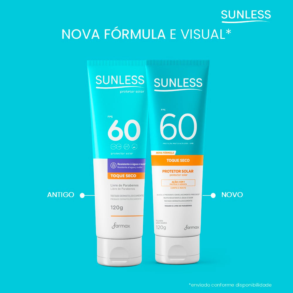 O Protetor Solar Sunless Fps 60 120g é indicado para todos os tipos de pele, até as mais delicadas, apresenta ampla proteção contra os raios UVA e UVB, combatendo a formação de radicais livres, que ocasionam o envelhecimento precoce da pele em decorrência de exposição solar desprotegida. Além disso, é livre de parabenos, possui composição com toque seco, que não deixa a pele com sensação pegajosa, e ainda a mantém hidratada e macia. Benefícios: - Proteção UVA e UVB; - Combate radicais livres; - Evita envelhecimento precoce; - Livre de parabenos; - Não pegajoso. Modo de usar: Aplique abundantemente 15 a 30 minutos antes da exposição ao sol e sempre que necessário. Reaplicar sempre, após sudorese intensa, nadar ou banhar-se, secar-se com toalha e durante a exposição solar. Sobre a marca: A Farmax tem a missão de contribuir com o bem-estar, beleza e saúde das pessoas para que elas vivam melhor todos os dias. Esta é a premissa que norteia todas suas ações e buscam através dela conquistar seus objetivos. Está presente em todo o Brasil com oito marcas divididas em mais de 300 produtos nas linhas cosmética, farmacêutica e alimentícia. Atua também na produção de marcas próprias como Sunless, Hidraderm, Max Save e para grandes redes de varejo e distribuidores.