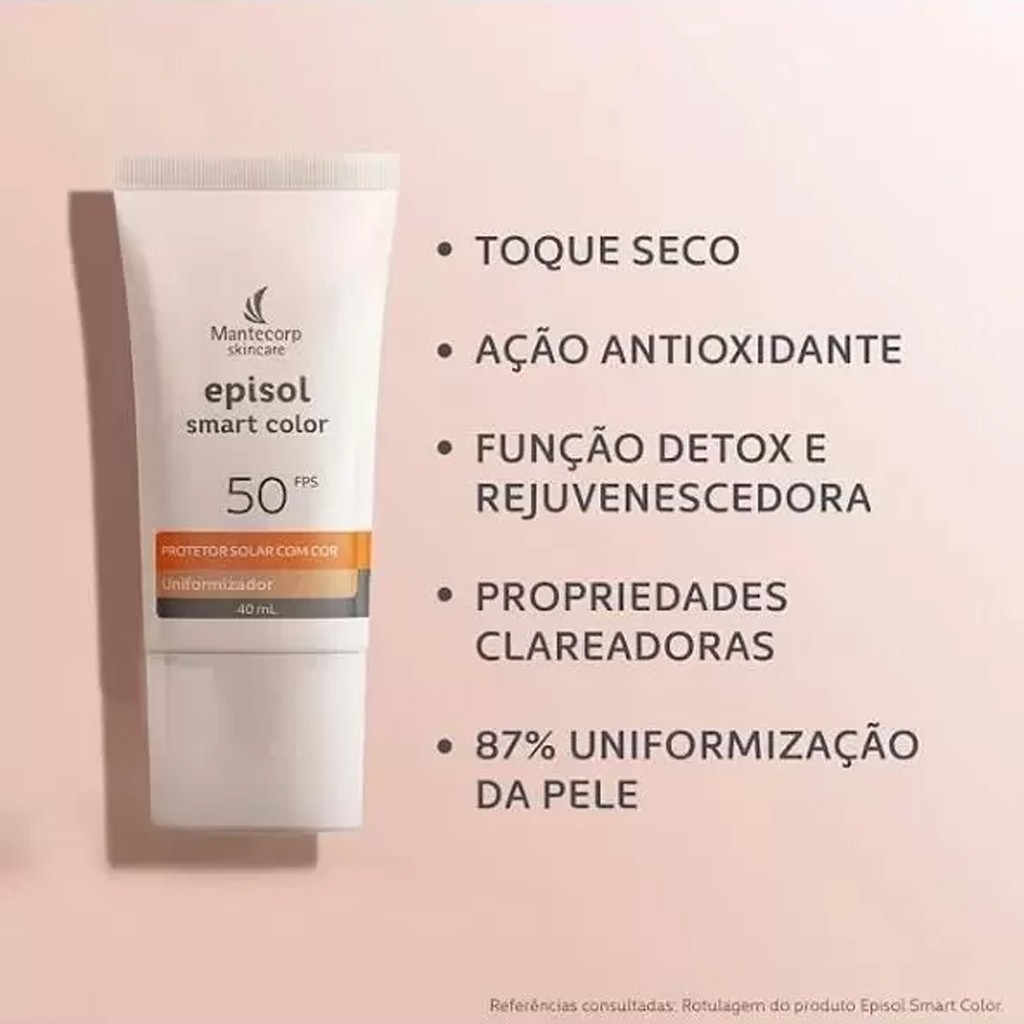 EPISOL SMART COLOR FPS50 é um protetor solar indicado para todos os tipos de pele. Sua tecnologia Smart Color, em que os pigmentos estão encapsulados, permite que a cor seja revelada ao ser espalhado para a pele, se adaptando aos diferentes tons.Oferece alta proteção contra os raios UVA e UVB e ajuda a proteger contra a luz visível. Tem ação rejuvenescedora e clareadora devido à presença da Niacinamida. Possui ação antioxidante que preserva o colágeno através de uma tecnologia inovadora que minimiza danos mais profundos na pele causados pelos raios infravermelhos. Proporciona toque seco e sensação de pele limpa, oferece boa absorção e fácil espalhabilidade. É um produto não comedogênico (não provoca cravos), dermatologicamente e oftalmologicamente testado desenvolvido para pele muito sensível à queimadora solar.O uso regular auxilia na prevenção do câncer de pele e de outros efeitos danosos causados pelo sol, como envelhecimento precoce. MODO DE USAR: O produto deve ser aplicado em abundância e uniformemente sobre a pele seca antes da exposição ao sol. Se a quantidade aplicada não for adequada, o nível de proteção será significativamente reduzido. É necessária a reaplicação do produto para manter sua efetividade. Reaplicar após sudorese intensa, nadar ou banhar-se, secar-se com toalha e durante exposição ao sol. Uso Diário