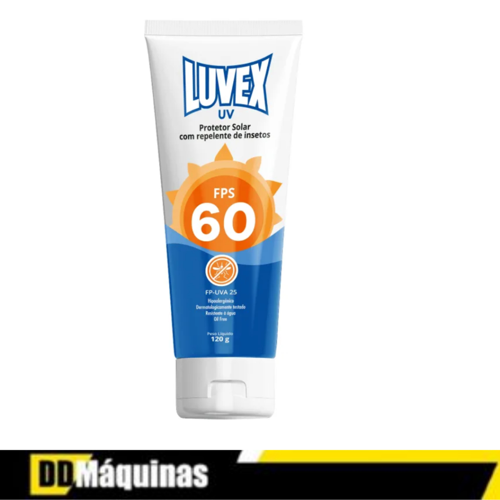 Protetor Solar UV FPS 60 com Repelente 120G Luvex O protetor solar Luvex UV FPS 60 com repelente de insetos protege a pele dos efeitos nocivos das radiações UVA e UVB e repele a ação de mosquitos, principalmente dos mosquitos causadores de doenças, pois sua fórmula contém IR3535. É dermatologicamente testado, hipoalergênico e atóxico. Possui vitamina E. A fórmula proporciona um excelente resultado em eficácia contra picadas de insetos e proteção contra radiações solares. Indicado para uso profissional em atividades em que o trabalhador está exposto ao ataque de insetos e/ ou radiações ultravioletas, tais como: agricultura, jardinagem, construções de estradas e edifícios, extrativismo, telefonia, eletricidade. TERMOS DE COMPRA 1 - Entrega via Shopee por transportadora. 2 - Prazo de Postagem é de até 24hs, validos apenas para dias úteis após a compra. 3 - O prazo de entrega informado no ato da compra é apenas um prazo estimado e não leva em consideração o prazo de postagem (item 2), podendo haver atrasos por parte da transportadora. O prazo de entrega informado é feito pela Transportadora da Shopee e não por nós. Faça o acompanhamento da sua compra para se certificar que nós postamos o seu produto no prazo informado no item 2. 4 - Todas as imagens são meramente ilustrativas; 5 - Caso o endereço esteja incorreto, o produto irá voltar e o pagamento será devolvido. 6 - É importante que se for necessário escolher alguma variação, escolha o Tamanho/ Modelo / Cor / Voltagem imediatamente 7 - Nossos produtos são originais e acompanham nota fiscal Garantia de 90 dias pelo fabricante Imagens meramente ilustrativas