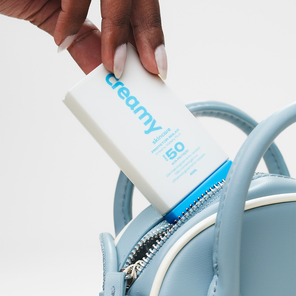 O Watery Fluid FPS 50 da Creamy é um protetor solar ultra fluido, de absorção rápida e acabamento invisível. Ele oferece alta proteção contra os raios solares, ao mesmo tempo em que ajuda a uniformizar a aparência da pele, deixando o tom mais homogêneo e com aspecto saudável. A textura leve e aquosa desse protetor solar foi pensada para todos os tipos de pele, inclusive as mais oleosas e sensibilizadas. Com controle de oleosidade por até 36h, você pode viver sua rotina na melhor versão: Com toque seco e efeito matte. Sua fórmula é não-comedogênica e não-acnegênica, ou seja, não obstrui os poros e não induz o aparecimento de acne, sendo uma excelente opção para peles acneicas ou com tendência a cravos e espinhas. Além disso, é oftalmologicamente testado, seguro para uso na região dos olhos, e desenvolvido com alta tolerância até mesmo em peles sensíveis. É aquele protetor solar que você sempre sonhou: Some na pele, não esfarela, não deixa marcas brancas e se integra facilmente à rotina, seja sozinho ou combinado com maquiagem e outros cuidados diários. Ainda, seu tamanho pocket permite carregá-lo sempre com você, para onde for, garantindo fácil reaplicação sempre que precisar. Principais benefíciosEfeito matte, com toque seco; Fácil aplicação; Textura leve de rápida absorção; Efeito invisível, não deixa resíduo branco na pele; Não oleoso; Sem aroma; Ideal para todos os tipos de pele, inclusive as oleosas e acneicas; Fórmula não-comedogênica, que não obstrui poros; Fórmula não-acnegênico, que não induz aparecimento de acne; Oftalmologicamente testado, seguro para uso na região dos olhos; Alta tolerância, inclusive em peles sensíveis; Controla a oleosidade por até 36h. Produto em açãoO resultado da ciência na sua peleVeja como os produtos da Creamy funcionam na prática. Texturas agradáveis, aplicação simples e performance que dá para sentir. Vídeos reais, sem filtros e sem mistério. Como usarAntes de usar, agite bem o produto. Use diariamente, com a pele limpa e seca, aplicando uma quantidade generosa no rosto antes da exposição ao sol. Para manter a proteção, lembre-se de reaplicar sempre que suar bastante, entrar na água, se secar com toalha ou durante longos períodos ao ar livre. Se você aplicar menos produto do que o recomendado, o nível de proteção pode ficar abaixo do esperado. Por isso, a reaplicação é essencial para garantir a eficácia do protetor.