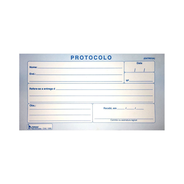 Protocolo entrega de correspondência com 100 folhas - Tamoio Protocolo para certificação de entrega. Detalhes: - Papel sulfite 56 g/m². - Formato: 155 mm x 80 mm - Bloco com 100 folhas