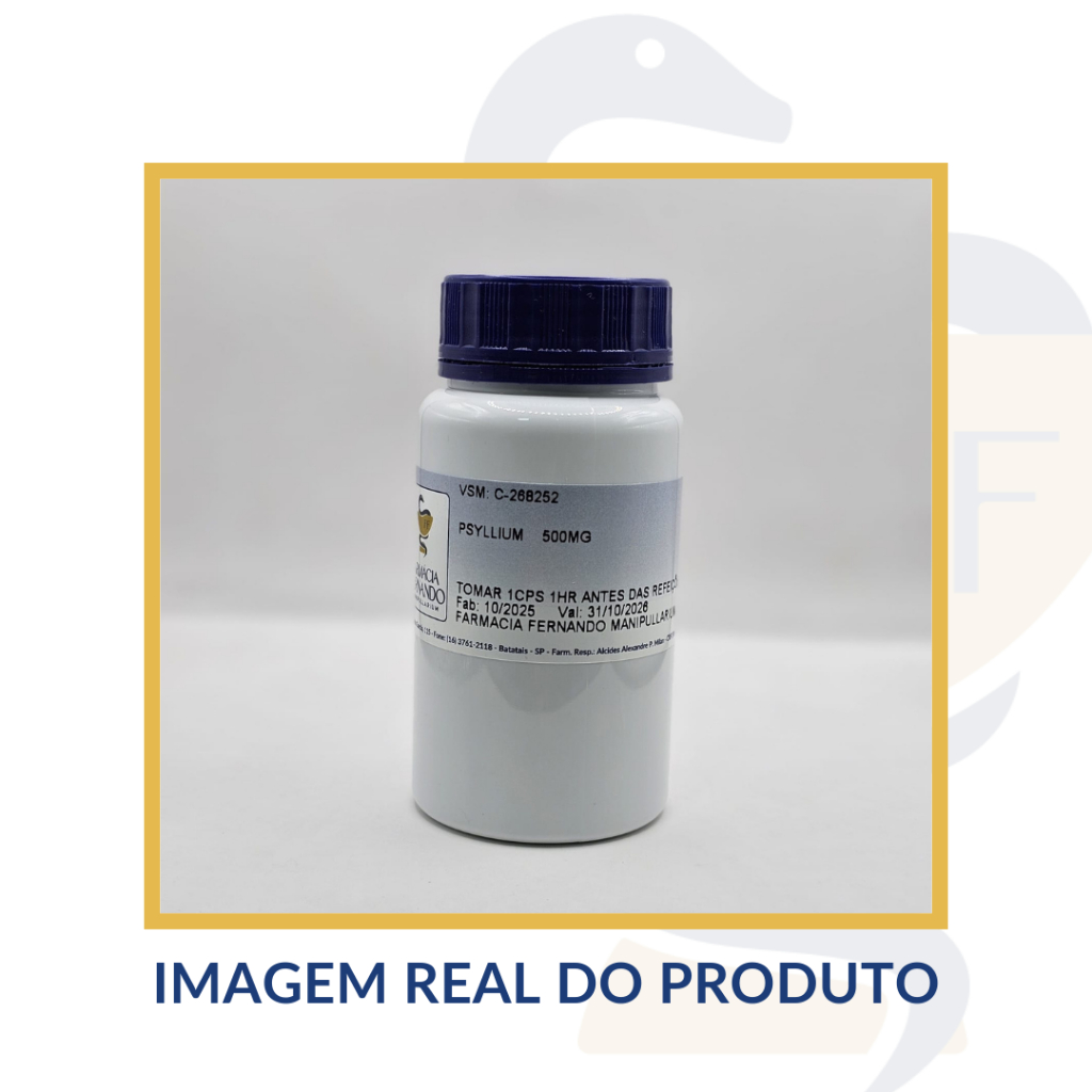 Seja bem-vindo à Farmácia Fernando Manipullarium! Desde 1894, trabalhamos exclusivamente com fornecedores certificados, sempre oferecendo produtos de alta qualidade. É um prazer atendê-lo! ______________________________________ Você recebe nesta compra: Psyllium 500mg, pote com 60 doses (60 cápsulas) ✅ FÓRMULA MANIPULADA ✅ QUALIDADE GARANTIDA ✅ COM NOTA FISCAL ✅ ENVIO EM 24 HORAS Ficou com dúvida? Chame a gente via chat, será um prazer te atender! ______________________________________ - COMPOSIÇÃO POR DOSE (1 CÁPSULA): Psyllium 500mg Excipiente qsp. (SEM GLÚTEN - SEM LACTOSE) ______________________________________ - SUGESTÃO DE USO: Tomar 1 cápsula 1 hora antes das refeições. ______________________________________ - VALIDADE: 12 MESES, A PARTIR DA DATA DE FABRICAÇÃO. Fique tranquilo, você receberá em sua casa uma produção recente! ______________________________________ - CONSERVAÇÃO: Após aberto, manter a embalagem bem fechada e armazenar em local fresco, seco (15° a 25°) e ao abrigo de luz. Produto lacrado para sua proteção. Não utilizar em caso de violação. Manter fora do alcance de crianças. ______________________________________ - ADVERTÊNCIAS: Gestantes, idosos, crianças, lactantes e pessoas que apresentam doenças ou alterações fisiológicas, somente devem consumir este produto sob orientação. ______________________________________ - REFERÊNCIAS: Literaturas de fornecedores. ______________________________________ ''ISENTO conforme resolução RDC 27 de 06 de agosto de 2010 anexo I.'' Este produto não deve ser utilizado por menores de 18 anos sem orientação. Imagens meramente ilustrativas. Os resultados e indicações referentes ao uso desse produto foram avaliados e comprovados pelo fabricante deste insumo farmacêutico. Não garantimos os resultados descritos, estes variam de pessoa para pessoa dependendo de diversos fatores como alimentação, prática de exercícios físicos, presença de outras patologias, bem como, o uso correto do produto conforme descrito na posologia.”