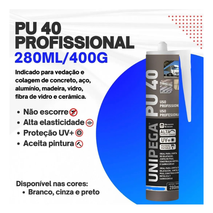 | PU40 Preto Unipega Selante Híbrido Alta Resistência Colagem e Vedação este produto | R$ 21,90 | — | 4.8/5 | — |