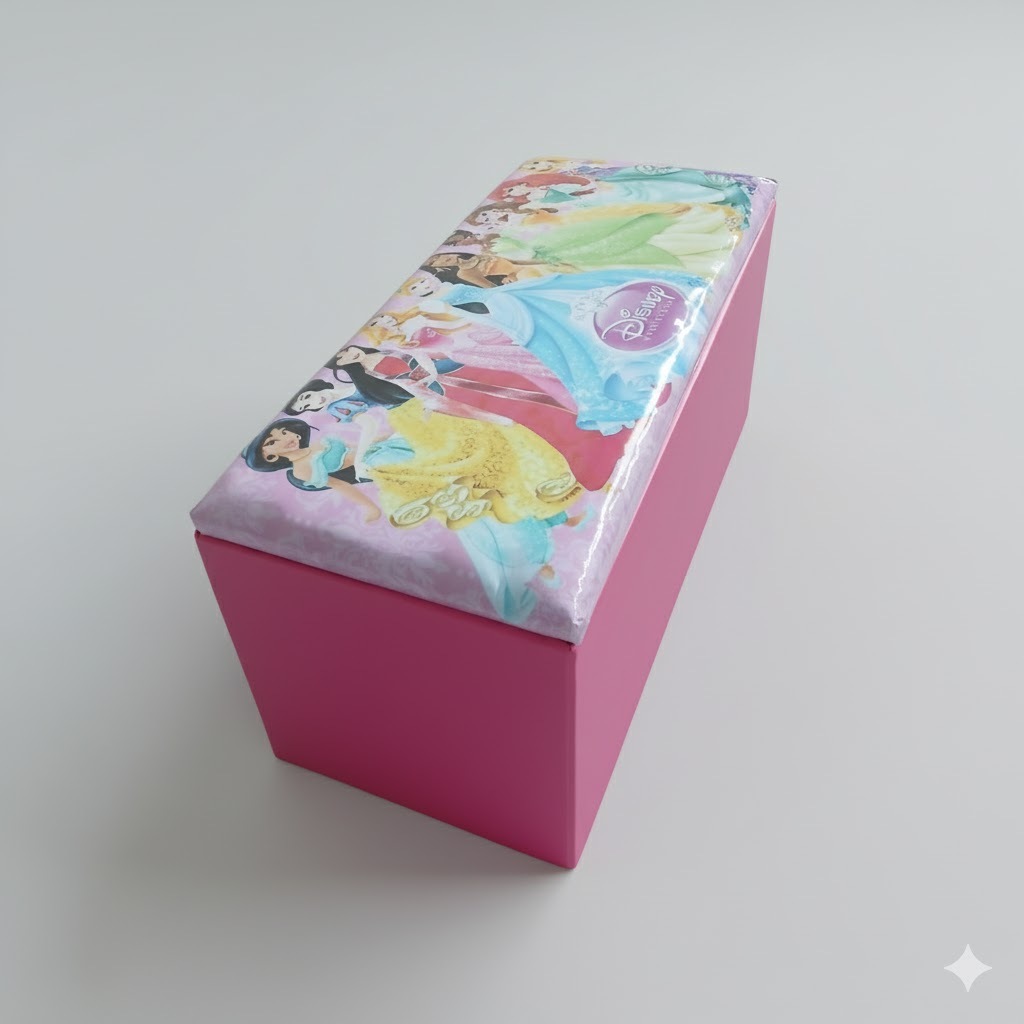 Puff Baú Princesas Infantil 90x45x45cm Organizador Decorativo Guarda Brinquedos Quarto Menina