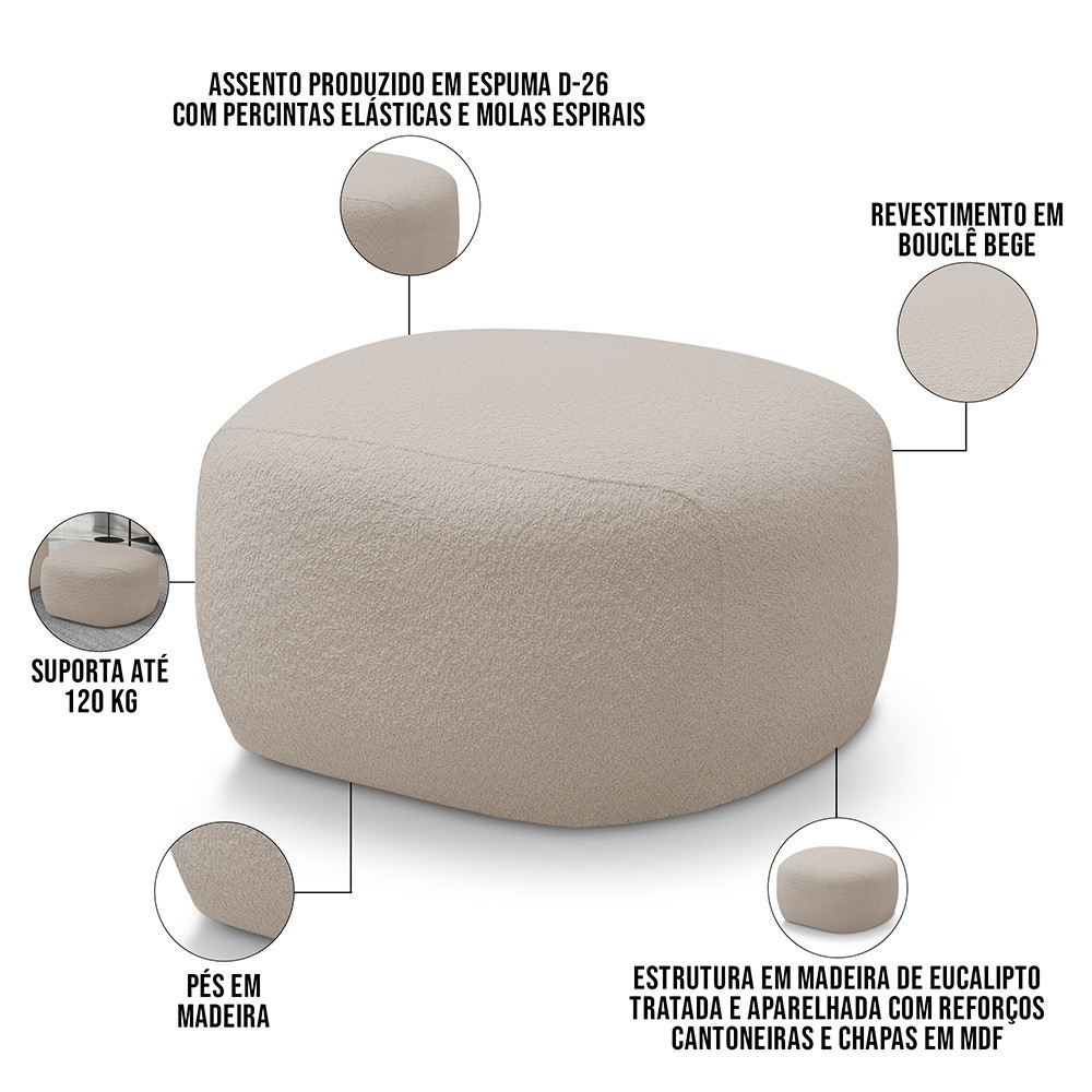 O Puff Decorativo Orgânico Para Sala Living Barolo, da Lyam Decor, é a escolha perfeita para quem procura um design moderno para sua sala de estar ou living. Com design contemporâneo expresso nas linhas curvas, esse puff orgânica combina perfeitamente com uma decoração moderna e elegante, já que a fluidez do design curvo harmoniza facilmente com qualquer ambiente. Já a qualidade alto-padrão fica por conta da tapeçaria feita com espuma alta densidade, enquanto o revestimento em Bouclê garante um toque macio e suave. Se você busca sofisticação e conforto, esse puff retangular é a opção ideal para completar o seu ambiente. Adicione ao seu carrinho e aproveite! Dimensões do Puff (L x A x P) 67 x 42 x 63 cm Características: Estrutura em madeira de eucalipto tratada e aparelhada com reforços, cantoneiras e chapas em MDF. Revestimento em tecido Bouclê de alta qualidade na cor Bege. Assento composto por espuma D-26 e molas espirais. Percintas elásticas para maior resistência e durabilidade. Pés em madeira. Peso suportado: Até 120 kg. - Nunca sentar nos braços ou encosto do produto. - Por se tratar de estofado as medidas podem ter uma pequena variação de até 3 cm. - A tonalidade do produto real poderá ter ligeira variação devido o lote de tecidos. - Indicado para uso residencial, sua limpeza deve ser feita com pano levemente umedecido em água limpa, sem esfregar, não utilizar produtos abrasivos, desengordurantes, álcool ou solvente. Observações importantes: - Produto para uso residencial em ambiente interno, não devendo ficar exposto diretamente ao sol, calor e umidade excessivos. - Pode haver alguma diferença de tonalidade entre a imagem e o produto real, por conta do tratamento de imagens e a calibração de cores do seu monitor. - As imagens são meramente ilustrativas, não acompanham objetos de decoração e eletrônicos. - Ao receber a mercadoria, o cliente deve verificar as condições da embalagem, caso haja alguma avaria não assine o comprovante de recebimento e entre em contato com nossa loja para orientações. - Montagem, desmontagem e outras instalações serão de responsabilidade do cliente. Não nos responsabilizamos, no ato da entrega, por subir escadas/elevadores ou pelo transporte por guincho em apartamentos. Eventuais despesas são de responsabilidade do comprador. - Confira as dimensões do produto e certifique-se de que passará normalmente por supostos elevadores, portas, escadas e/ou corredores de sua residência. - Para mais informações, acesse nossa Central de Atendimento.