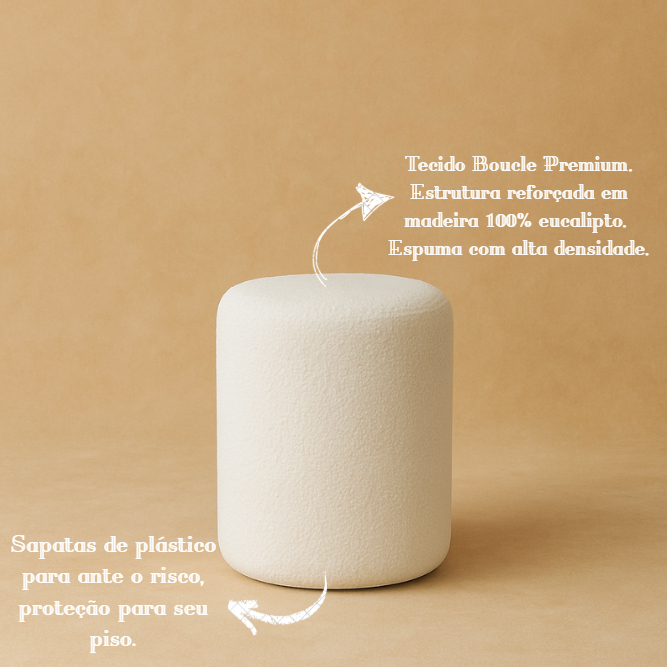 Versátil, elegante e com acabamento impecável. O puff Mono é o complemento ideal para ambientes que valorizam o conforto com um toque de sofisticação. Revestido com tecidos premium Boucle, ele oferece uma textura leve, neutra e fácil de combinar com diferentes estilos de decoração. Sua estrutura robusta garante durabilidade, enquanto o design arredondado proporciona um visual suave e moderno. Perfeito para ser usado como assento extra, apoio para os pés ou até como mesa de centro. Medidas: -Altura: 46cm -Largura: 34cm -Comprimento: 34cm SUPORTA ATÉ 130KG Principais Dúvidas: 1 - O puff precisa estar encostado na parede para uso? Não necessariamente. A maioria dos puffs é projetada para ser utilizada de forma independente, sem a necessidade de apoio adicional . 2 - O puff serve apenas como assento? Não. Além de assento, puffs podem ser utilizados como apoio para os pés, mesas auxiliares. 3 - Onde posso usar um puff na minha casa? Puffs são versáteis e podem ser utilizados em diversos ambientes, como salas, quartos, varandas e até cozinhas. Eles também são comuns em espaços comerciais como salas de espera e clínicas . 4 - Como é feita a limpeza e manutenção do puff? A limpeza depende do material do revestimento. Recomenda-se o uso de aspirador para remover poeira. Produto fabricado e entregue por Dávila Decor.
