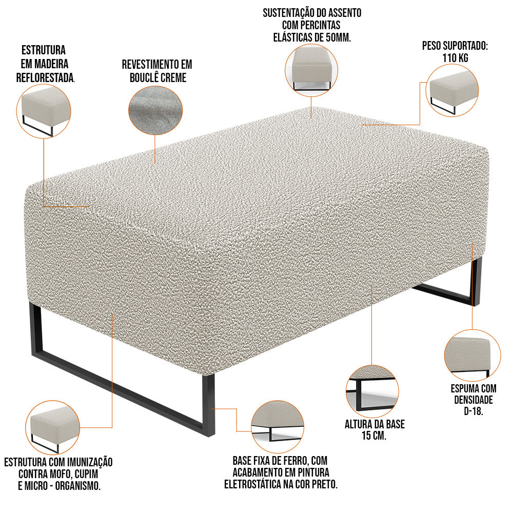 Puff Decorativo Sala De Estar Cléo 90cm Base De Ferro Preto W01 Bouclê Creme - Lyam Decor
