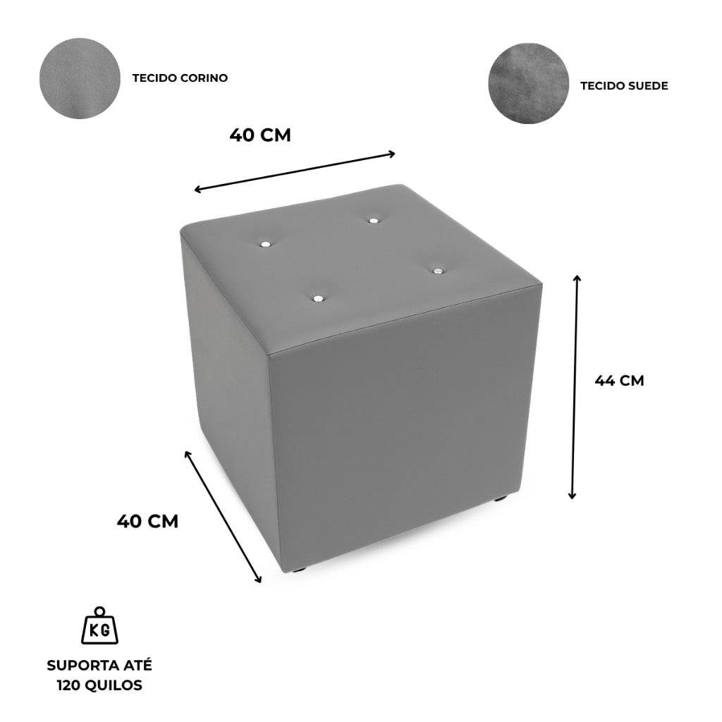 Puff Quadrado Grande 40x40 Reforçado e Confortável — Ideal para Sala, Quarto e Recepção Dimensões: Altura: 42,00cm Largura: 40,00cm Comprimento: 40,00cm Especificações: Densidade Espuma: D22; Peso: 3Kg Pezinhos reforçados: além de garantirem melhor estética, suportam mais peso do que os dos concorrentes; Espuma nova e higiênica: utilizamos espuma nova e livre de ácaros e bactérias; Estrutura com 6 colunas de madeira que garantem maior resistência; Maior conforto: Por se tratar de um puff quadrado com dimensões maiores "40x40"; Ideal para: - Sala de estar, Quartos, Varanda, Closet - Salão de beleza/barbearia, Loja de roupas e Calçados, Recepção - Casamentos e festas, Espaços de confraternização, Feiras e estandes - Salas de espera, Salas de descompressão, Espaço de reuniões Conosco você encontra: - Entrega Rápida - Fabricação própria - Produção em larga escala Recomendações: Tecido Corino: - Efetue a limpeza com produtos apropriados para tecido sintético, assim, evitará manchas e amarelados, prolongando a vida útil do produto e mantendo suas características padrões. (Pano com água fria e Detergente neutro) - Hidrate o tecido com produtos apropriados mensalmente para manter seu brilho e durabilidade. Indicamos o seguinte produto: Vaselina. - Tecidos sintéticos não são resistentes ao calor, por isto, não indicamos o produto para ambientes externos, onde o mesmo ficará exposto à luz solar. Tecido Suede: - Passe o aspirador de pó com um bocal de escova macia sobre o suede semanalmente para remover poeira e partículas soltas. - Mantenha longe da luz solar direta, pois isso pode desbotar a cor ao longo do tempo. - Limpe manchas imediatamente com um pano limpo e seco, se a mancha persistir, use um produto de limpeza de suede específico e siga as instruções do fabricante. - De tempos em tempos, contrate um profissional para fazer uma limpeza profunda e tratamento de proteção em seu Suede.