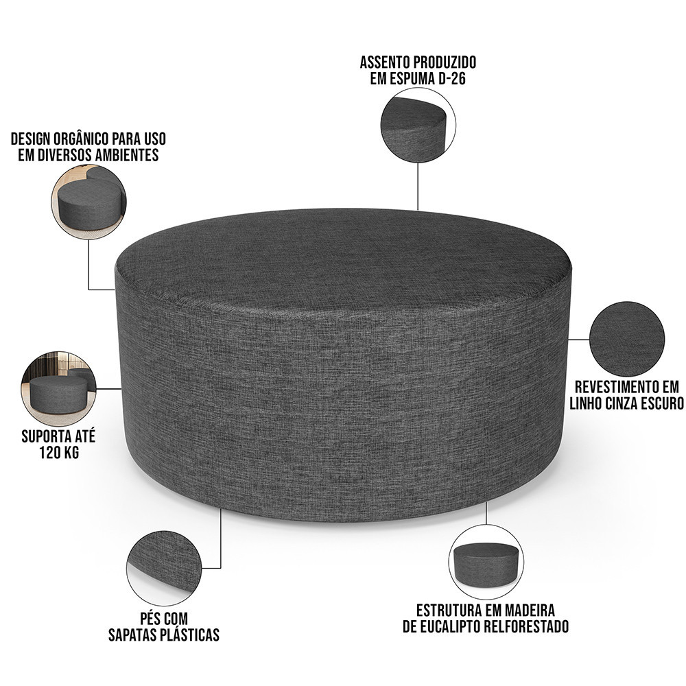 Puff Redondo Orgânico para Living 90cm Lola W01 Linho Cinza Escuro - Lyam Decor
