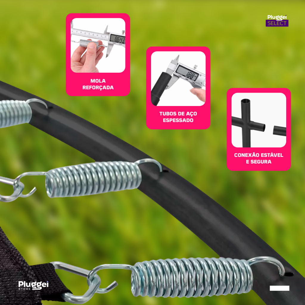 Pula Pula Cama Elástica Trampolim Infantil 1.55m com rede Esse modelo de Cama Elástica é ideal para ser utilizada em locações, residências, escolas, brinquedotecas, buffets, hotéis, clubes, centros esportivos, entre outros. -Proteção de molas com revestimento PVC + PE colorido e impermeável com manta expandida área interna. -Lona de salto em polipropileno com proteção UV, sem emendas e com referência no centro, facilitando a utilização do produto. -Estrutura 100% em aço galvanizado a fogo (interno e externo). -Hastes Bi-Partidas galvanizadas revestidas com isotubos blindados com proteção UV. -Rede de proteção interna em polipropileno com proteção UV e entrada com zíper, proporcionando maior segurança às crianças. MONTAGEM Fácil sistema de montagem realizado por encaixe Acompanha manual de instruções para montagem. DADOS TÉCNICOS Diâmetro do Trampolim: 1,40m Qtda de Molas galvanizadas: 36 unidades Qtda de Pés: 12 pçs Qtda Hastes: 06 Bipartido (12 peças) Altura : 1,55m Peso Máximo: 80Kg se for uma única pessoa, ou 150kg no total (deve-se considerar a somatória das crianças que estarão usando a cama elástica ao mesmo tempo, somando o peso total delas não pode passar de 150Kg, pois dessa forma o peso estará distribuído. Por Exemplo: Criança A (40Kg) + Criança B (50Kg) + Criança C (45Kg) = 135kg . Está dentro do peso limite. obs: O modelo do ziper é o curvado ( U ) Idade sugerida: A partir de 3 anos, acompanhadas por adultos. ATENÇÃO: As partes de ferro, que são cobertas pela espuma colorida, podem ir ou não pintados de preto, a depender do lote, mas isso não afeta o design do produto pois eles são cobertos pela espuma.