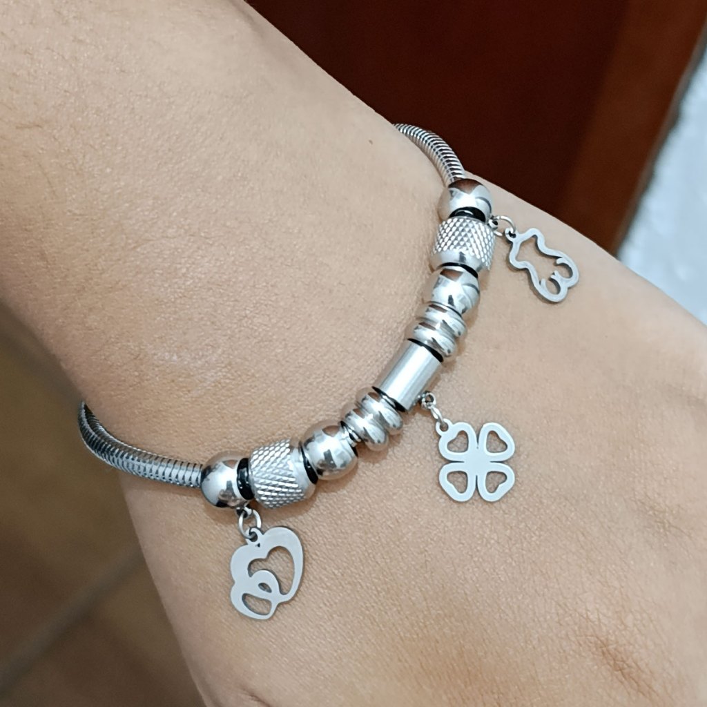 Pulseira Adulto/Infantil 17 ao 24 com Berloques Modelo Novo Ajustável Maleável Aço Garantia Não Escurece CONTE SUA HISTÓRIA COM SUA PULSEIRA Essa pulseira é feita de aço inox prateado, um material resistente e durável que é fácil de limpar e manter. A pulseira é projetada para ser usada com berloques e tem o fecho tipo lagosta, ajustável garantindo que o berloque esteja seguro e fácil de abrir. Cor: prateada Material: aço Inox Fecho: tipo lagosta ajustável de 17 ao 24 cm. Se você está procurando por uma pulseira de alta qualidade e resistente para usar com berloques, essa é a escolha certa. * Nunca altera a cor * Pode molhar e suar * Pode usar na praia e piscina * Não da alergia * Ótimo custo benefício * Não é descartável, acessório eterno Tenha praticidade e liberdade em sua vida, com aço inoxidável está sempre linda e arrumada sem te atrapalhar. MATERIAL: Aço Inoxidável Cuidados: fique tranquila quanto a utilização, seja livre pra usar o tempo todo em qualquer ocasião. Nossa única recomendação é não usar o acessório durante exercícios de impacto. O MELHOR METAL PARA ACESSÓRIOS