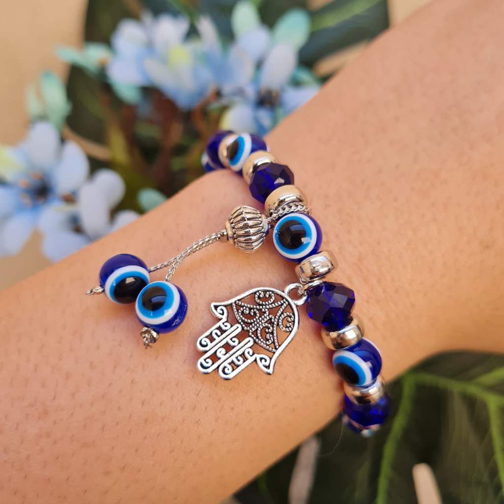 Pulseira Azul Olho Grego Mão Hamsá Prateado Feminina Turco