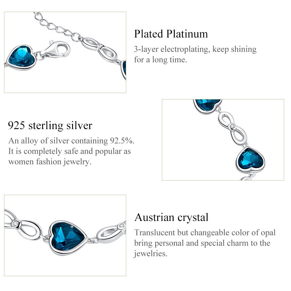 Pulseira Bamoer 925 Prata Brilhante Azul Coração Zircônio Jóias SCB163