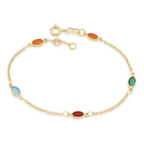 Pulseira Banhado Ouro Fio Elo Português Cristais Coloridos 551624