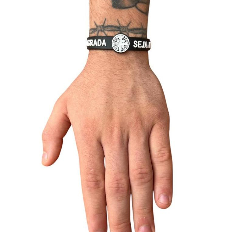 Pulseira,Católica Medalha De São Bento Silicone Escrita A Cruz Sagrada Seja Minha Luz Varias Cores Lançamento