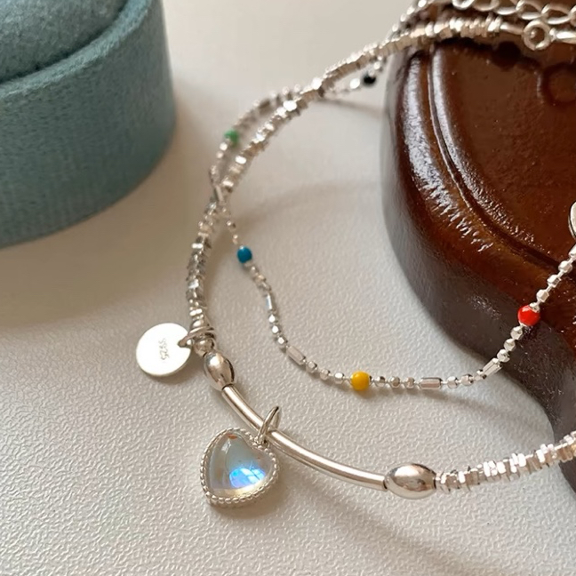 Pulseira colorida de prata esterlina com coração de pedra da lua, feminina, nicho simples, pulseira de alta qualidade