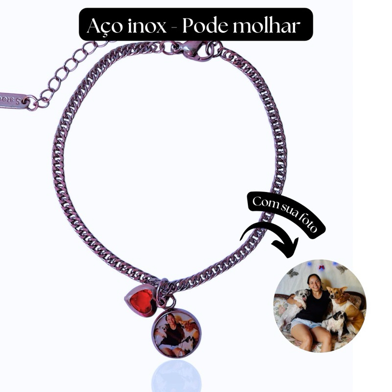 Pulseira com pingente personalizado com sua foto, aço inox a prova d’água. Não perde a cor, antialérgico.