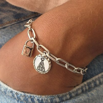 Nossa Senhora Aparecida, Padroeira do Brasil, é a mãe que acolhe todos os seus filhos com amor incondicional. Encontrada nas águas do Rio Paraíba por humildes pescadores, ela escolheu este povo para chamar de seu. Carregar sua imagem é sentir esse abraço materno todos os dias. "Nossa Senhora Aparecida, mãe e padroeira do Brasil, cobri-me com vosso manto de proteção. Amém." Use no pulso como sinal de consagração à Padroeira do Brasil — um lembrete vivo de que você nunca está só. ✨ Características: - Corrente em aço inox resistente à água e suor - Medalha com imagem de N. Sra. Aparecida - Pingente de cadeado — símbolo de consagração - Acompanha cartão com oração 🎁 Presente perfeito para o Dia das Mães, 12 de outubro e Natal. 📿 Leve ou presenteie com a proteção da Padroeira do Brasil.