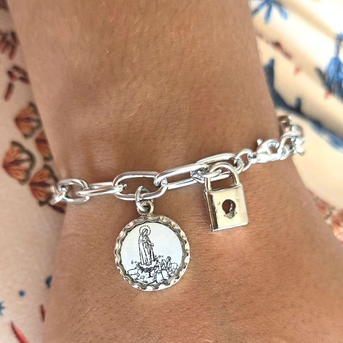 Nossa Senhora de Fátima apareceu a três pastorinhos em Portugal com uma mensagem de paz, oração e conversão para o mundo. Sua devoção atravessa gerações e continentes. Carregar esta pulseira é renovar o compromisso com a oração e a confiança na proteção de Maria. "Nossa Senhora de Fátima, Rainha do Rosário, trazei a paz ao mundo e protegei os que confiam em vós. Amém." Use no pulso como sinal de consagração à Nossa Senhora de Fátima — uma lembrança de fé e esperança em tempos difíceis. Material: aço inox • Resistente à água e suor • Medalha com imagem de N. Sra. de Fátima • Cadeado de consagração • Acompanha cartão com oração Leve a mensagem de Fátima no pulso — ou presenteie alguém que precisa de paz. 🙏