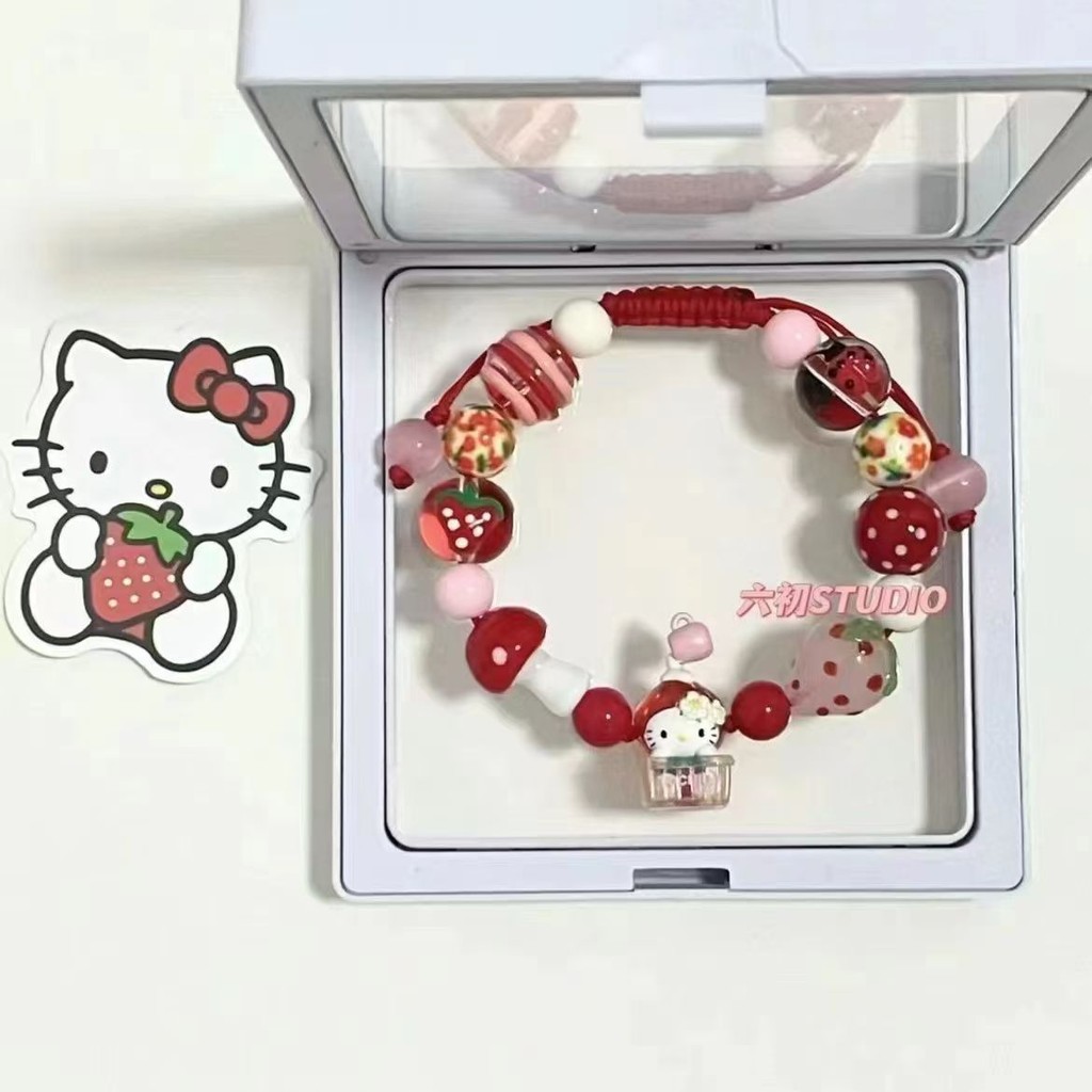 Pulseira De Corda Trançada Com Contas De Morango Vermelho Fofo HelloKitty
