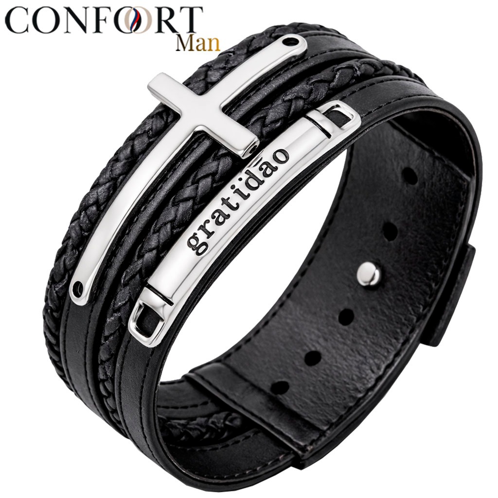 Pulseira de Couro Masculina Cruz Gratidão Proteção Resiliência - Vários Modelos