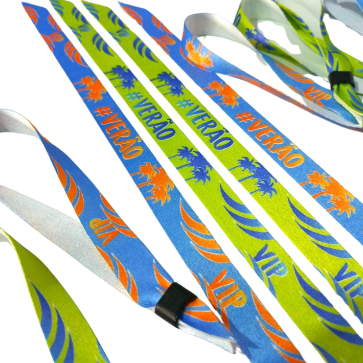 Pulseira de Tecido para Identificação Totalmente Personalizada ** LEIA A DESCRIÇÃO ** ARTE GRÁTIS Impressão em sublimação Só Frente / Verso branco Medidas: 15mm x 36cm Corte: Chanfrado nas pontas para acabamento Arte: Montamos arte conforme sua necessidade. Fazemos a arte das pulseiras SEM custo adicional * Ótima para Identificação em festas, shows, boates, bares, clubes, excursões e em diversos outros eventos. * Fácil colocação nos pulsos, confeccionadas em material poliéster acetinado, impressão em sublimação, acabamento impecável. * Medidas: 15mm x 36cm, chanfrado nas pontas para acabamento. Personalizamos com sua logomarca, nome ou o que desejar que seja escrito.