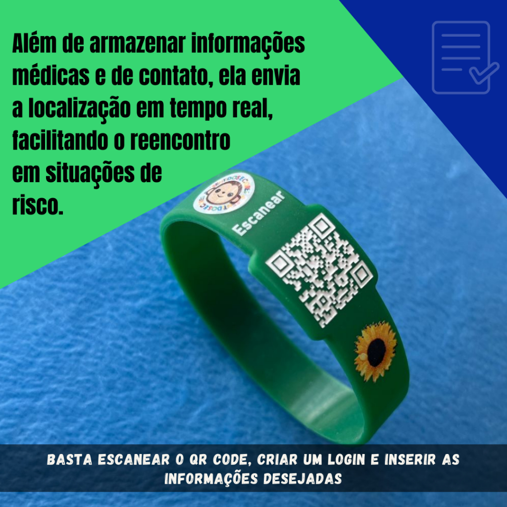 Pulseira QR Code Conecta Sentidos & Cores Girassol Oferecendo segurança e praticidade, esta pulseira apresenta mais de 8 funções essenciais, incluindo dados pessoais, contatos de emergência e ficha médica. Características: - Material: Silicone antialérgico, à prova d'água - Tamanhos variados para diferentes faixas etárias - Instruções simples para uso e suporte exclusivo para membros Ideal para viagens, atividades diárias e emergências, garantindo cuidado e proteção para quem você ama. Envio imediato!