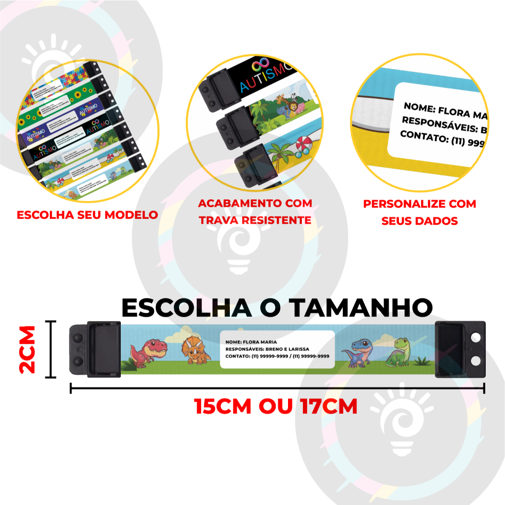 Pulseira de Identificação Infantil Personalizada de Tecido Diversos Temas Autismo Autista e Desenho