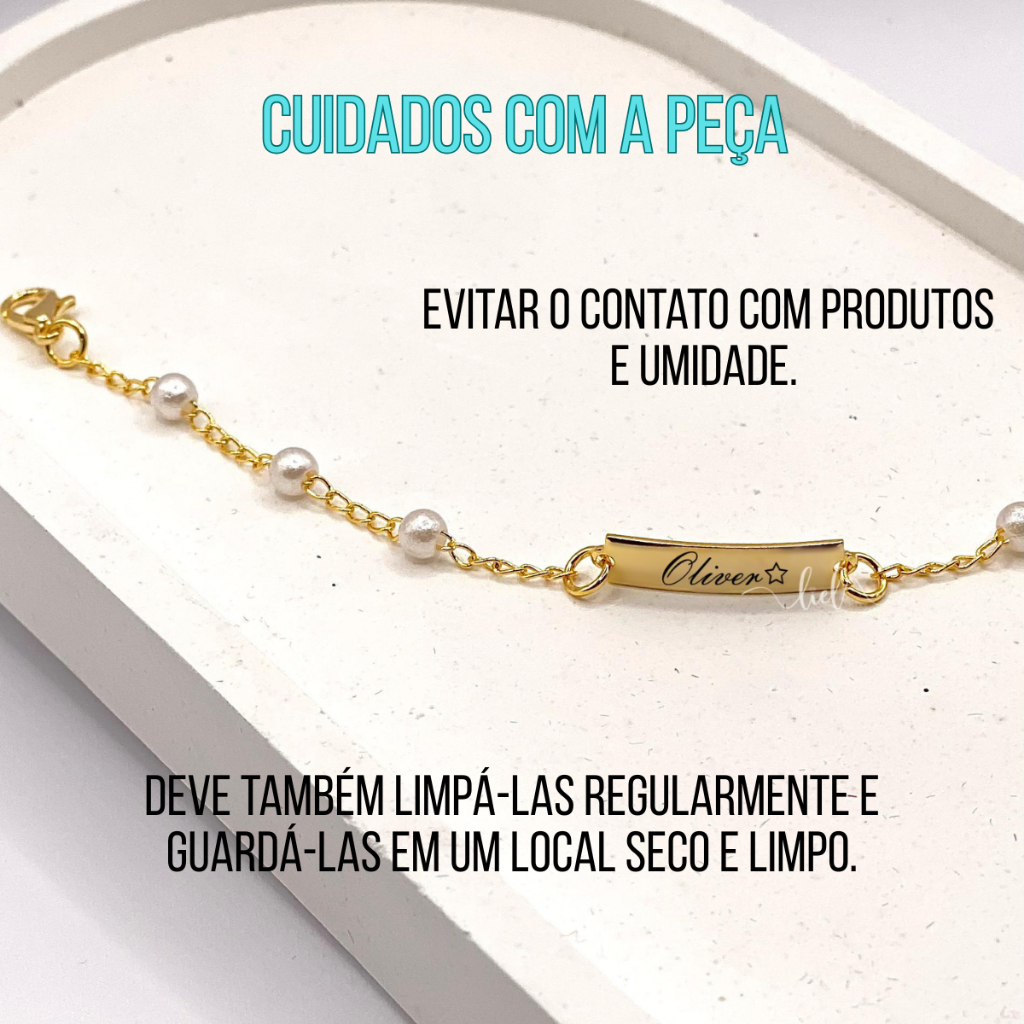 Pulseira De Pérola Infantil Dourada RN Bebê Personalizada Com Gravação Nome Banhada A Ouro 18k