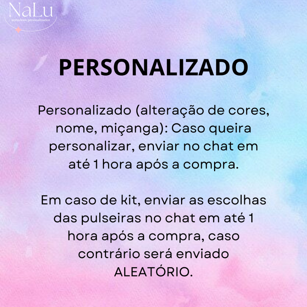 -MATERIAL: Fio de silicone (0,8 mm) ou Fio de Lastex + Miçangas variadas. -TAMANHOS: PP: 14 cm P: 16 cm M: 18 cm G: 20 cm GG: 22 cm Como saber meu tamanho? Envolva a fita métrica ao redor do seu pulso, logo abaixo do osso do punho, com os números virados para cima. Certifique-se de que ela não esteja muito apertada: a fita métrica deve poder girar confortavelmente no pulso. Feche a fita métrica como se fosse a própria pulseira. PS: O tamanho da pulseira pode sofrer variação de 0,5 cm. -ATENÇÃO: * As quantidades de miçangas podem mudar de acordo com o tamanho da pulseira. * As miçangas podem variar (cor, modelo) dependendo dos materiais que possuímos disponíveis. * As cores das letras podem variar, dependendo dos materiais que possuímos disponíveis. * Cores podem sofrer variações devido a tela e iluminação das fotos. -PERSONALIZAÇÃO(Alterações de Cores/Nome): Caso queira personalizar, enviar em até 1 hora após a compra no chat. -Em caso de escolha de KIT, enviar as escolhas de pulseiras em até 1 hora após a compra no chat ou será enviado aleatório. -ENVIO: Por se tratarem de acessórios realizados de acordo com os pedidos, tem o prazo para envio de até 3 dias úteis. Em caso de dúvidas estamos a disposição!