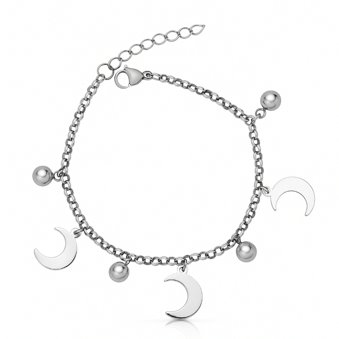 Pulseira Feminina Aço Inox com Pingentes Lua e Esferas – Ajustável, Resistente e Hipoalergênica