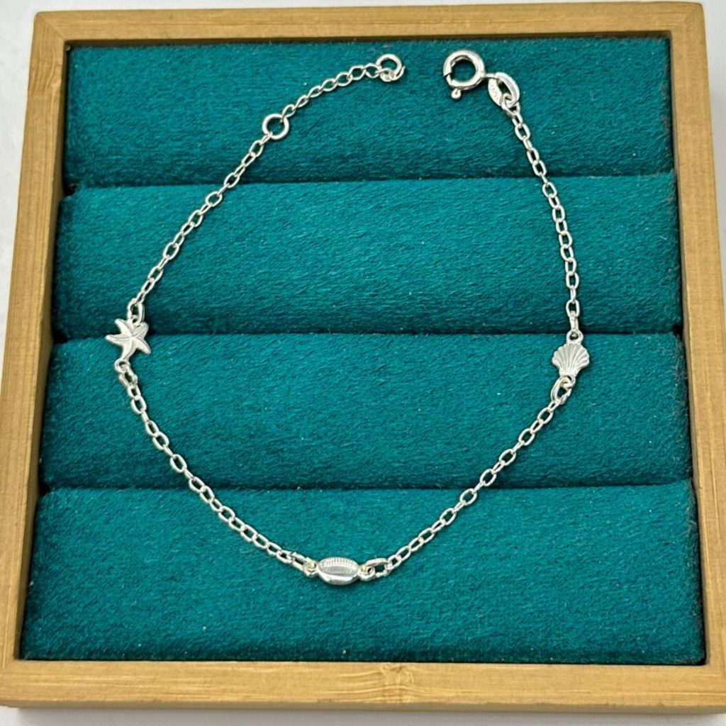 Pulseira Feminina de Prata 925 Elo Cadeado com Elementos do Mar A Pulseira Feminina de Prata 925 Elo Cadeado com Elementos do Mar é uma celebração ao oceano, trazendo um toque especial e delicado de charme marítimo. Perfeita para quem ama a natureza e deseja manter um pedacinho do mar sempre por perto, essa pulseira é uma peça de estilo e simbolismo. Especificações Tamanho: 18cm + 2cm de extensor Largura: 1,8mm Tamanho dos Pingentes: Búzio (5mm), Concha (5mm), Estrela do Mar (6mm) Fecho: Bóia Peso: 1,68g Material: Prata 925 Características Principais Charmosos pingentes marítimos que trazem o espírito do oceano Ajuste versátil com extensor de 2cm Design em Prata 925, de alta qualidade e durabilidade Descrição Detalhada Essa pulseira é um verdadeiro tributo ao mar e à beleza das praias. O elo cadeado delicado suporta pequenos pingentes de búzio, concha e estrela do mar, criando uma estética leve e única. Seu acabamento em Prata 925 é durável e garante um brilho elegante, ideal para o dia a dia ou ocasiões especiais. Com 18cm e extensor de 2cm, adapta-se perfeitamente ao seu pulso. Cuidados com o Produto Para preservar a qualidade da prata, evite exposição a produtos químicos e guarde a pulseira em local seco. Limpe com flanela específica para prata regularmente para manter o brilho e evitar oxidação. Adquira Agora Leve consigo a essência do mar com a Pulseira Feminina de Prata 925 Elo Cadeado com Elementos do Mar. Uma joia encantadora e simbólica que complementa qualquer estilo!