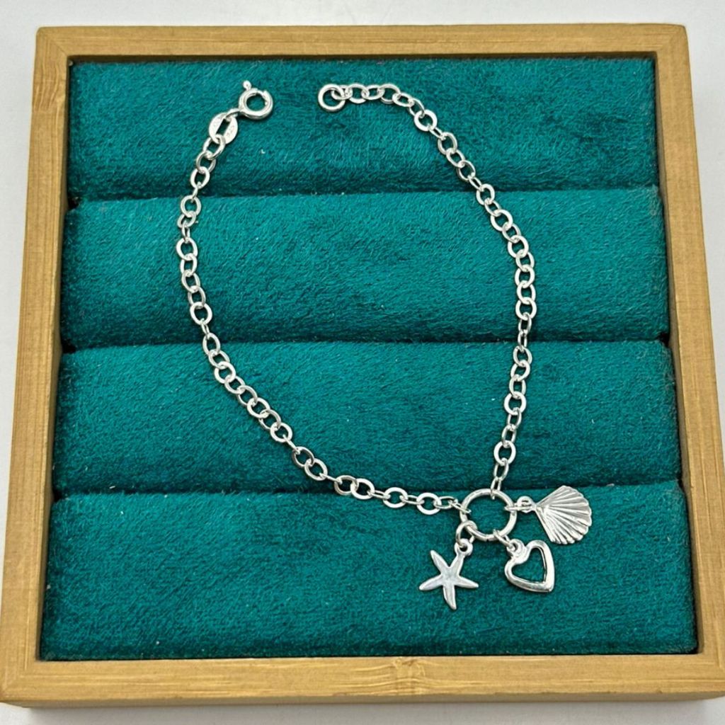 Pulseira feminina patuá estrela coração e concha prata 925