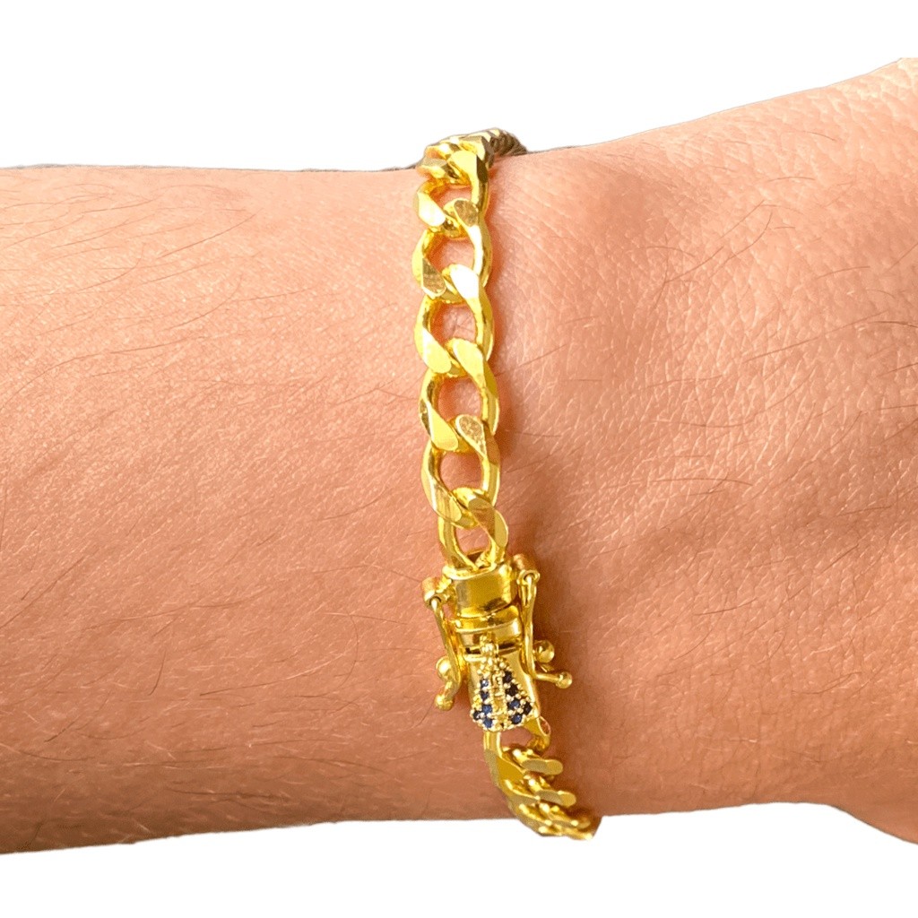 DESCRIÇÃO DO PRODUTO: PULSEIRA GRUMET 7MM - BANHO DE OURO 18K - MASCULINO - FFECHO EDIÇÃO ESPECIAL NOSSA SENHORA Saquinho aveludado para acomodar joias. Metal: banhado em ouro 18k (10 camadas em ouro) Tipo de Corrente: GRUMET 7MM Tipo de Fecho: FEIXO GAVETA EDIÇÃO ESPECIAL NOSSA SENHORA Tamanho da Corrente: 21CM Peso da corrente: 5g Goldille Joias - Camada de Ouro muito mais espessa. - Aspecto visual semelhante a jóias de ouro maciça. ---------------------------------------------------------------------------------------------------------- Usamos e fazemos semi jóias banhadas por serem as melhores opções disponíveis atualmente. E nós da Goldille Jóias temos o melhor banho em Ouro 18k da melhor qualidade e eficiência. - Semi jóias banhadas em OURO AMARELO 18k, - ALTAMENTE polida e brilhante, - Banho MUITO MAIS RESISTENTE que qualquer outra semi jóia, - Confiamos na QUALIDADE E DURABILIDADE dos nossos produtos, - Por isso damos com total segurança GARANTIA DE 1 ANO referente ao banho. NOSSAS JOIAS SAO FABRICADAS COM LIGA DE METAIS MAIS EFICAZES PARA ABSORÇÃO E FIXAÇÃO DO OURO DURANTE O PROCESSO DE BANHAR! ----------------------------------------------------------------------------------------------------------- Utilizamos um processo que se chama ***GALVANOPLASTIA***, responsável pela aderência da camada de Ouro " Metal Nobre " a peça base ( feito por imersão ). Utilizamos também banhos que define polimento, brilho e acabamento; o que garante a beleza e a elegância das Semi Jóias Goldille. Nosso banho de cobre alcalino garante para as nossas semi jóias uma textura acetinada e brilhante.