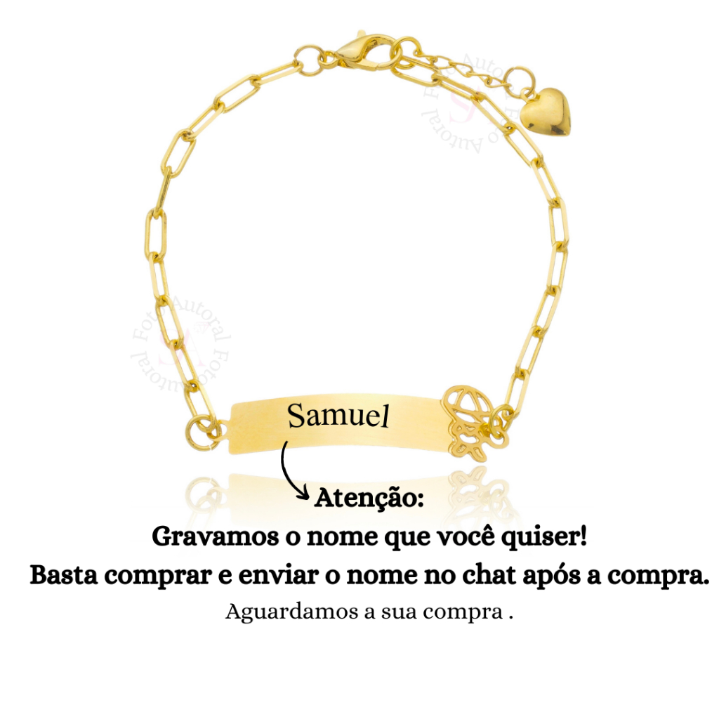 ATENÇÃO: Após a compra informar a gravação em até 12 HORAS, caso não seja enviada no prazo enviaremos sem gravação. Pulseira Infantil delicada com gravação a Laser grátis! Acompanha: Pulseira com Gravação do nome + Saquinho de veludo Banhada a OURO 18k MATERIAL ANTIALÉRGICO COM ACABAMENTO PREMIUM. CARACTERÍSTICAS DO PRODUTO: Medida da Chapinha: 2 a 3 cm aproximadamente, varia de acordo com o modelo escolhido. Medida PADRÃO total da Pulseira: 14cm + 3cm extensor Gravação do nome Gratuita DÚVIDAS FREQUENTES: 1- ONDE DEVO INFORMAR O NOME A SER GRAVADO? Após realizar a compra, enviar o nome a ser gravado no chat. 2- A PULSEIRINHA É INDICADA PARA QUAL IDADE? Indicamos o uso para crianças de 0 a 5 anos. ATENÇÃO: Após a compra informar a gravação em até 12 HORAS, caso não seja enviada no prazo enviaremos sem gravação.