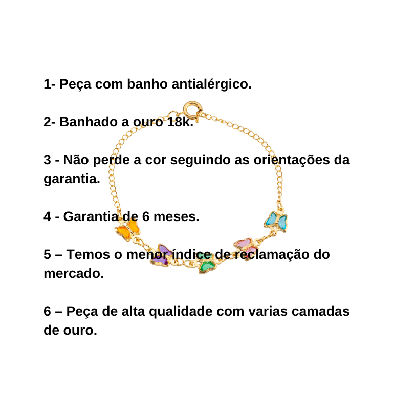 Acompanha caixa de presente igual da foto ANDREIA BRANCO SEMI JOIAS - Somos uma empresa especializada em semi joias de alta durabilidade, atuando 8 anos no mercado.. - Nossas peças também recebe um antialergico de alta qualidade (PALÁDIO), não contem níquel. - Nosso banho de ouro é um dos poucos do mercado que tem a tonalidade real do ouro. - Nossa empresa da 6 meses de garantia nesse produto. - Trocas somente com certificado de garantia. *********DESCRIÇÃO DO PRODUTO ************** PULSEIRA INFANTIL DELICADA E COLORIDA DE BORBOLETAS BANHADA À OURO 18K COMPRIMENTO: 13,5 CM