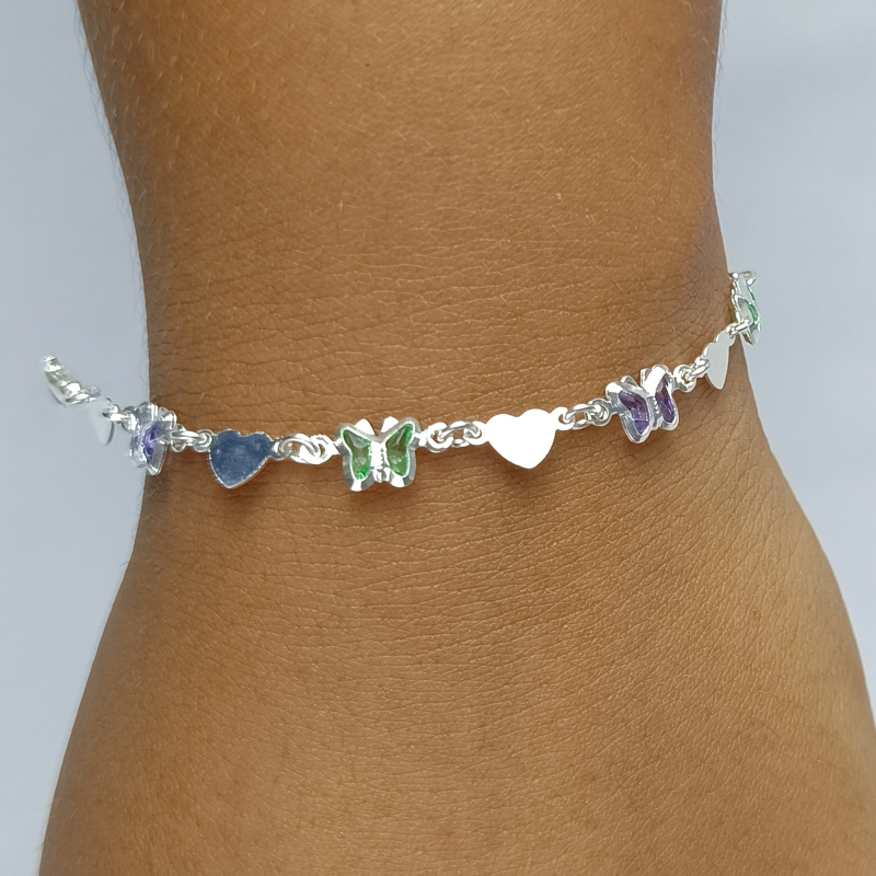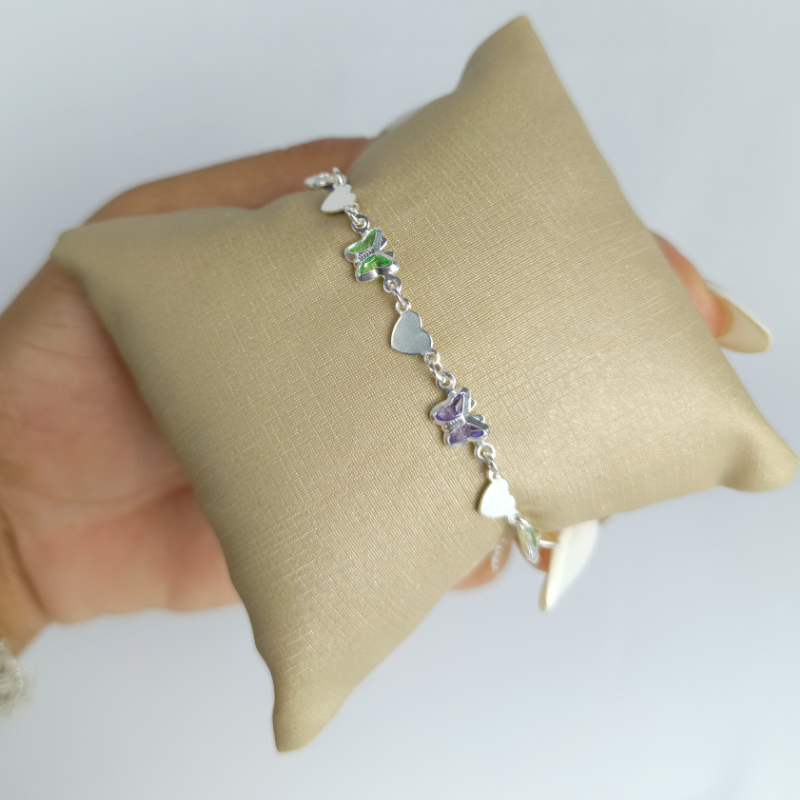 Pulseira Infantil Prata 925 Borboleta com Coração Legitima Feminina Delicada