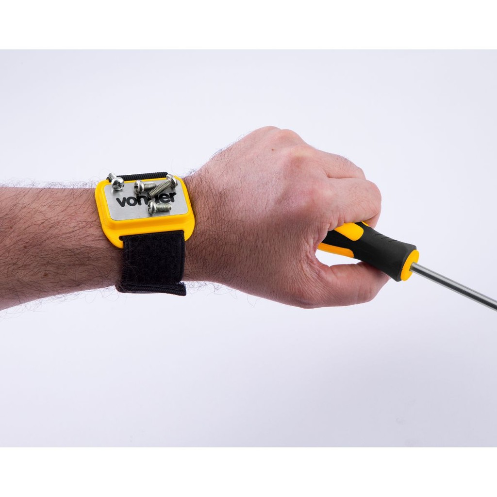 Indicada para segurar fixadores como parafusos, pregos e porcas, além de agulhas, pinos e outros pequenos produtos metálicos. Possui sistema de fechamento com sistema fixa fácil e pulseira em elastano, podendo ajustar-se a vários diâmetros. Conteúdo da Embalagem: 1 Pulseira magnética. Detalhes técnicos: Material: Cinta elástica com sistema fixa fácil Comprimento da pulseira: 26 cm Dimensões do ímã: 44 mm x 24,5 mm x 7 mm Quantidade de ímãs: 1 Massa aproximada (peso): 0,160 kg